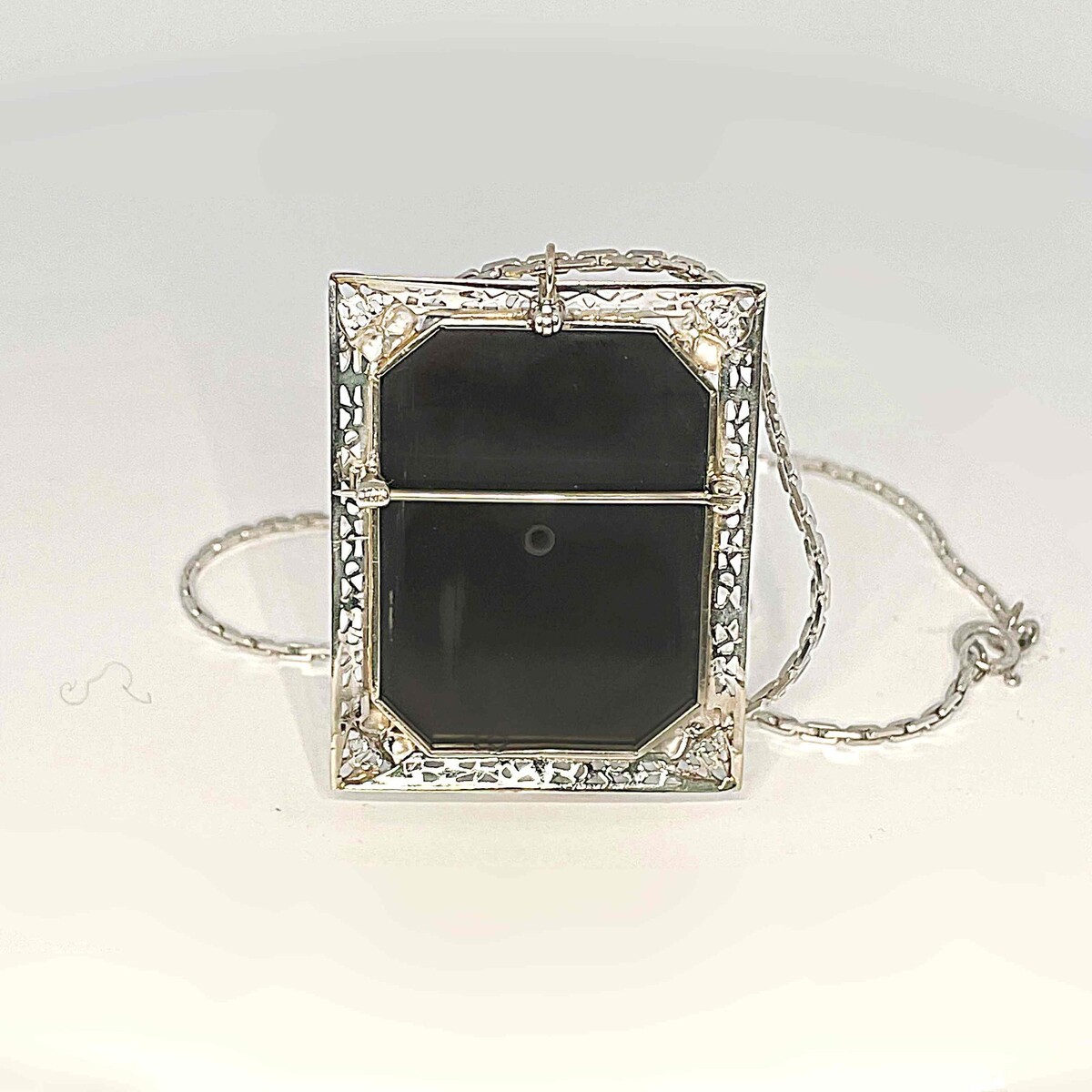 The chain is an Italian white gold chain. Clear 14K Italy stamps can be seen on the chain fittings. This lovely chain has been added at a later date and cannot be removed from the pendant at present.