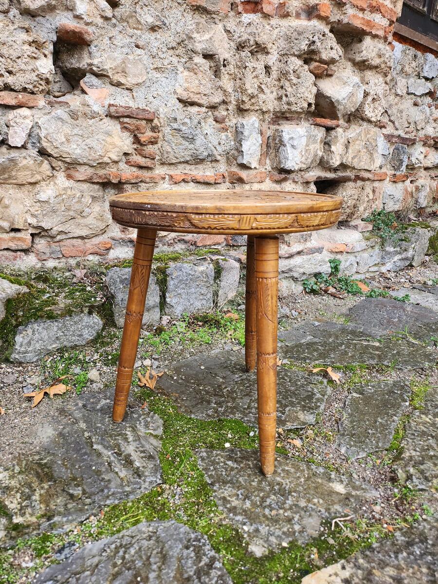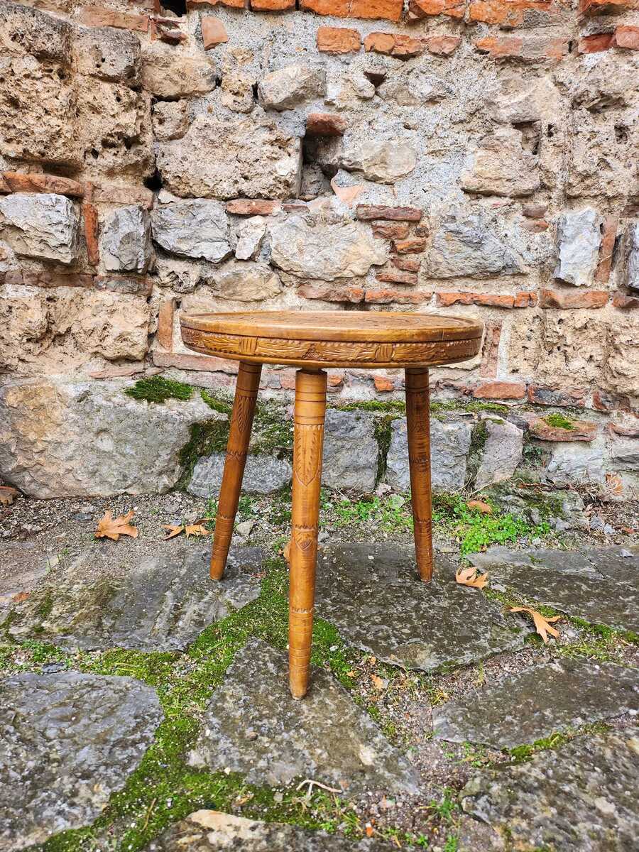 This is a lovely round coffee table made in the middle of the XX century in Intarsia style. The table is hand carved at the top with dominant flower pattern, typical for the Intarsia style and the leggings have a discreet hand carving. The table is kept in a very good condition for, without damages. Might be visible some small signs and scratches of use/age.