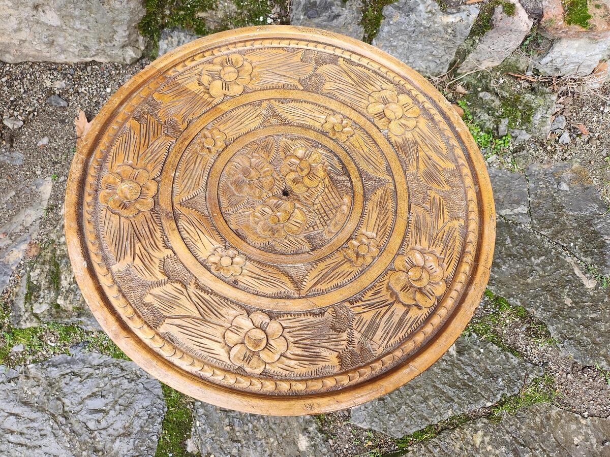 Antique wooden round table, Intarsia style table, hand carved wooden coffee tabl