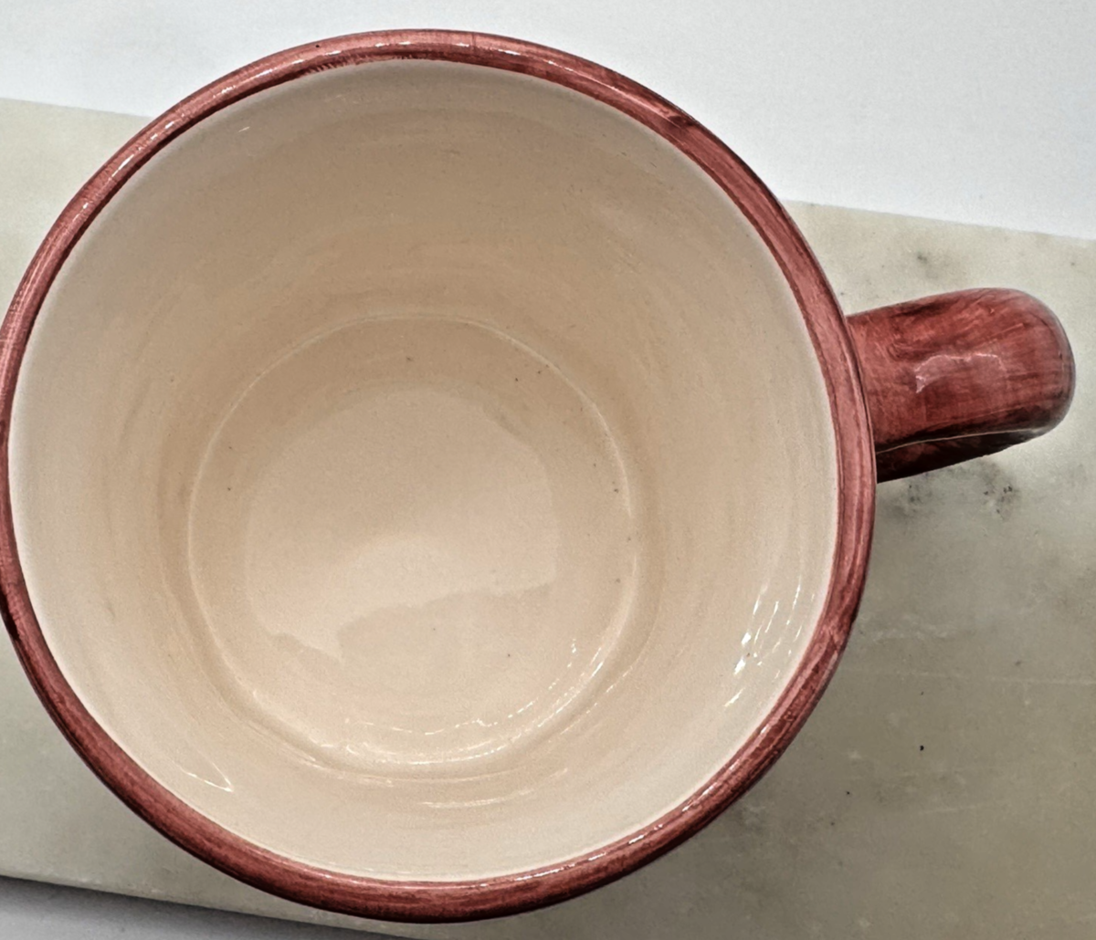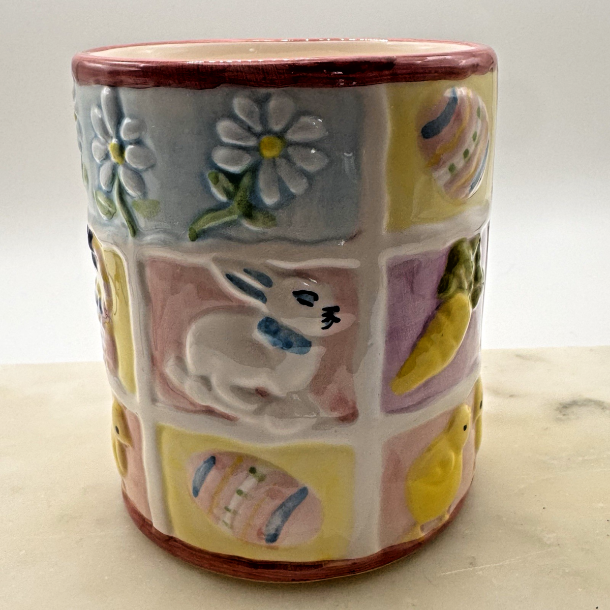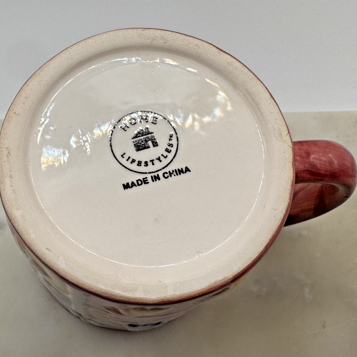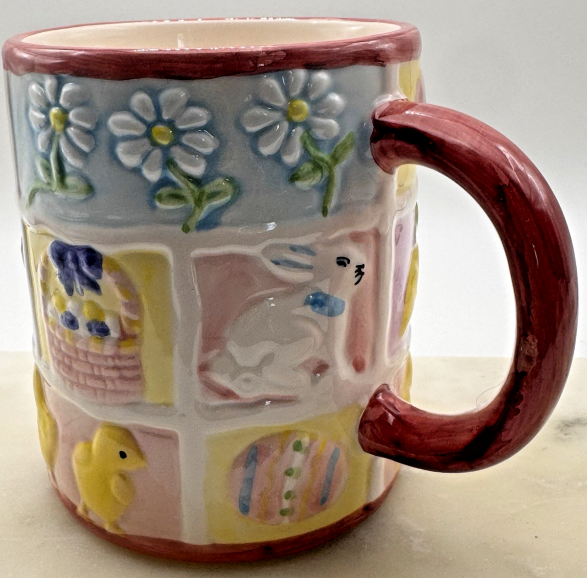 This cheerful spring-themed mug features a raised relief design with an Easter bunny, chicks, decorated eggs, daisies, and a basket motif wrapped around the entire mug. The colorful pastel panels and dimensional artwork give it a charming storybook look that feels perfect for Easter mornings, spring decor, or seasonal coffee and cocoa. It has a comfortable rounded handle and a glossy red rim that frames the design nicely. A fun collectible mug for Easter decor lovers or anyone who enjoys whimsical seasonal kitchenware. The bottom is marked ?Home Lifestyle ? Made in China.? Capacity is approximately 12 oz.