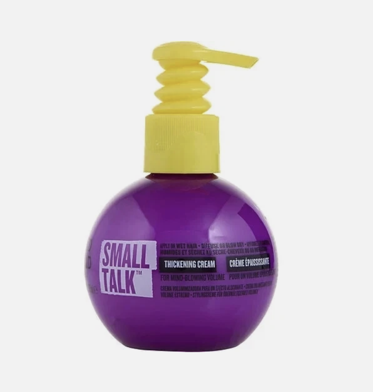 TIGI Bed Head Small Talk Thickening Cream is a multitasking 3-in-1 hair product designed to act as a thickener, energizer, and stylizer for fine, thin, or flat hair. It is formulated to amplify volume and body while simultaneously controlling frizz and static.
