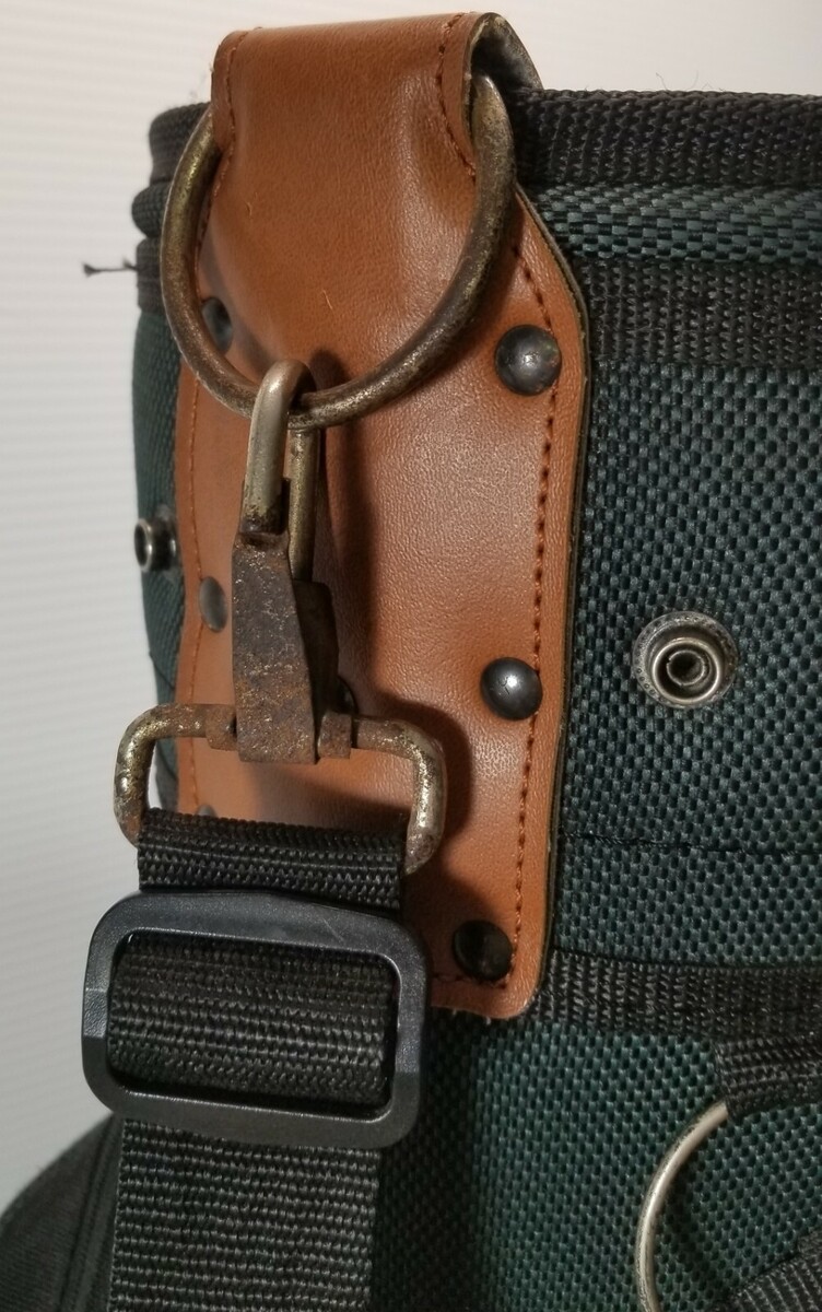 Bag is in overall good, used condition. The metal ring/clip of the shoulder strap has some rust but all other metal pieces zippers are in good shape. All zippers work and move freely.