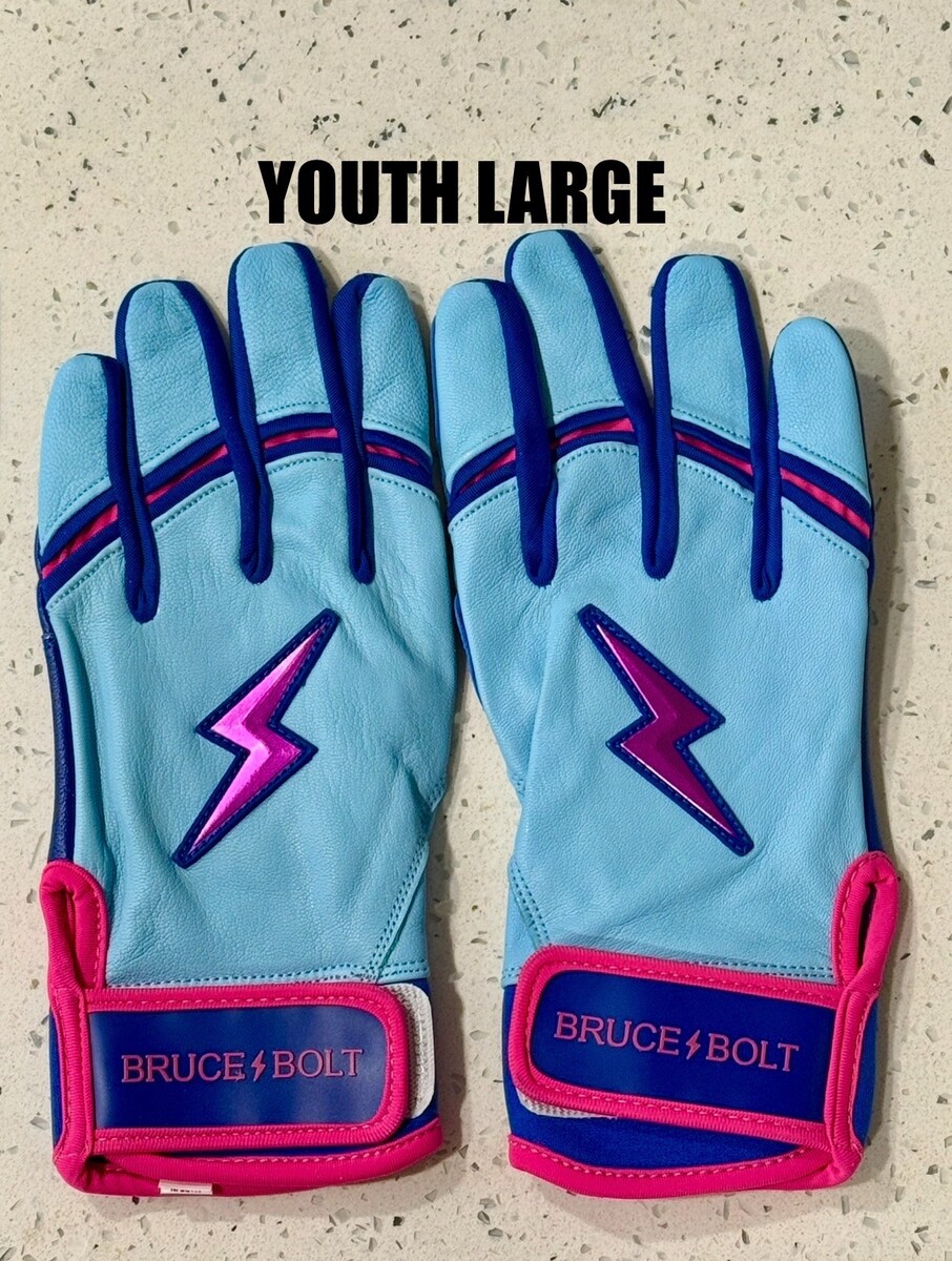 BRAND NEW YOUTH BRUCE BOLT BABY BLUE & PINK PREMIUM BATTING GLOVES YOUTH LARGE