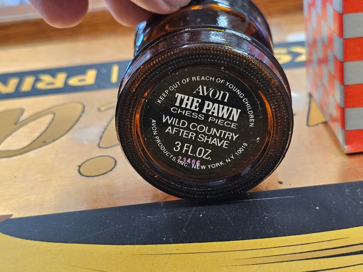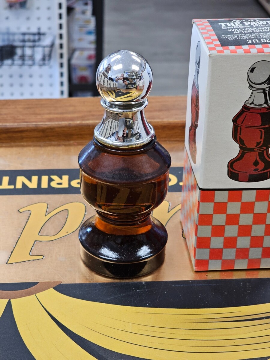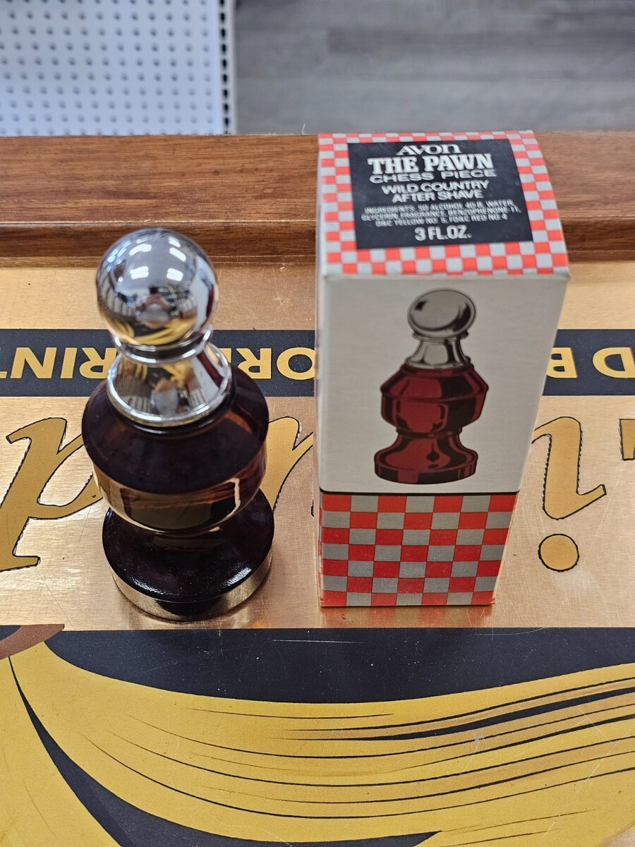 The product is a vintage Avon The Pawn Chess Piece Wild Country 3oz after shave bottle, complete with its original box. This collectible item is part of a series of perfumes and shaving products by Avon, known for their quality and collector's appeal. The unique design of the bottle as a chess piece adds to its charm and makes it a sought-after item for those interested in vintage collectibles. Perfect for adding a touch of nostalgia to any vanity or display.