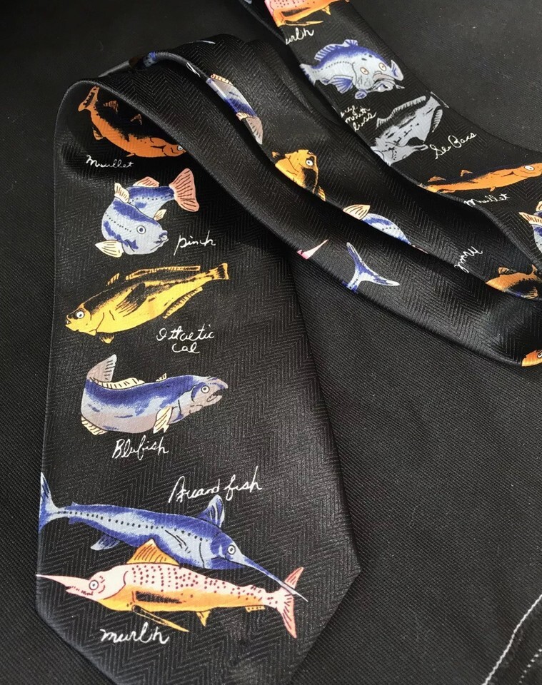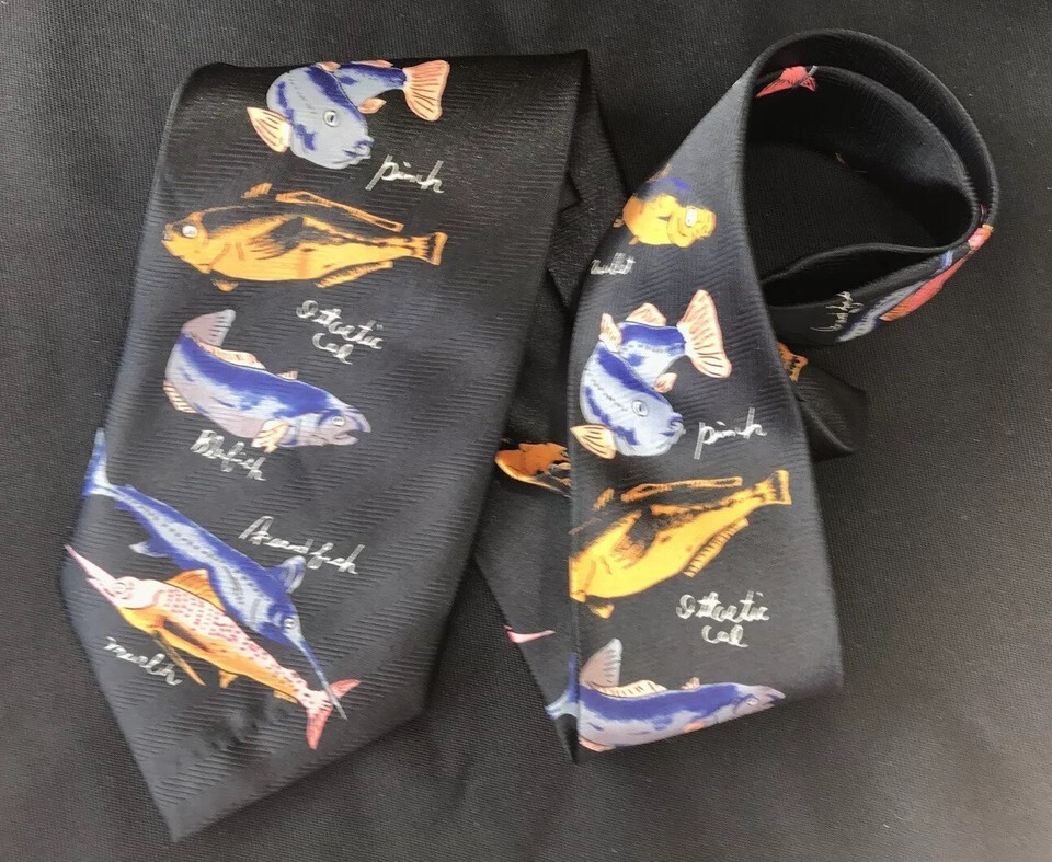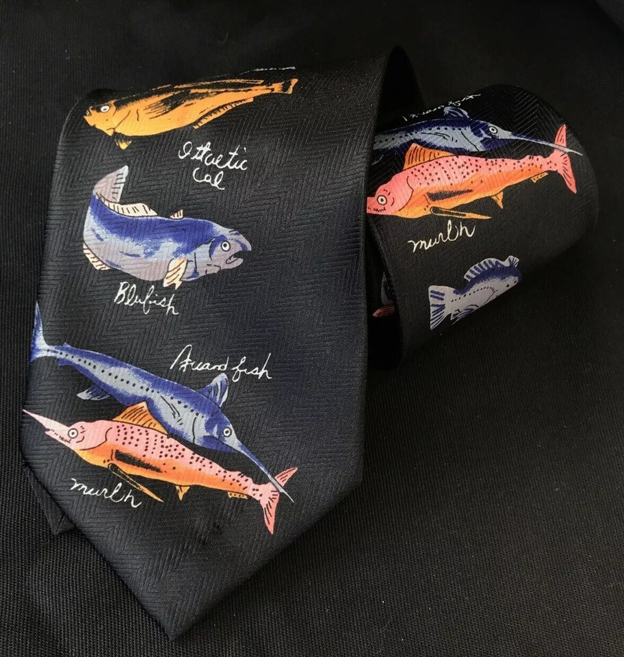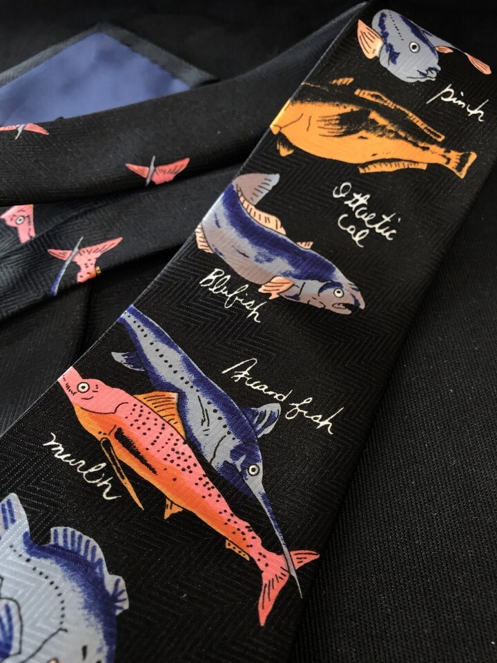 Vtg Brothers Nautical Fish Necktie Marlin Blufish Bass Mullet Trout Fishing Art
