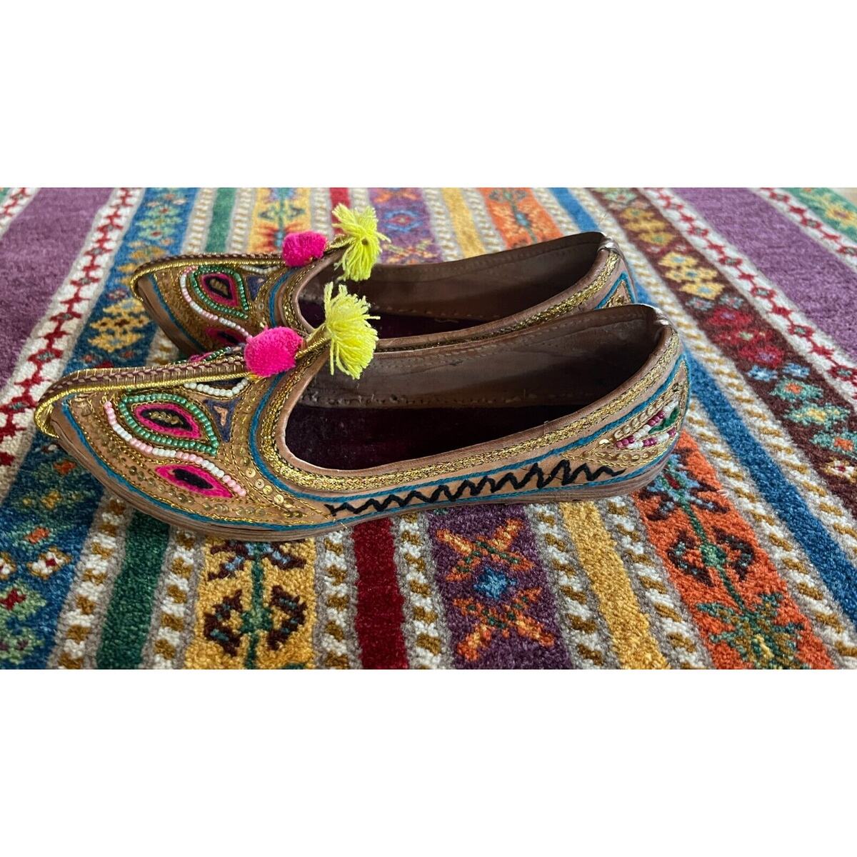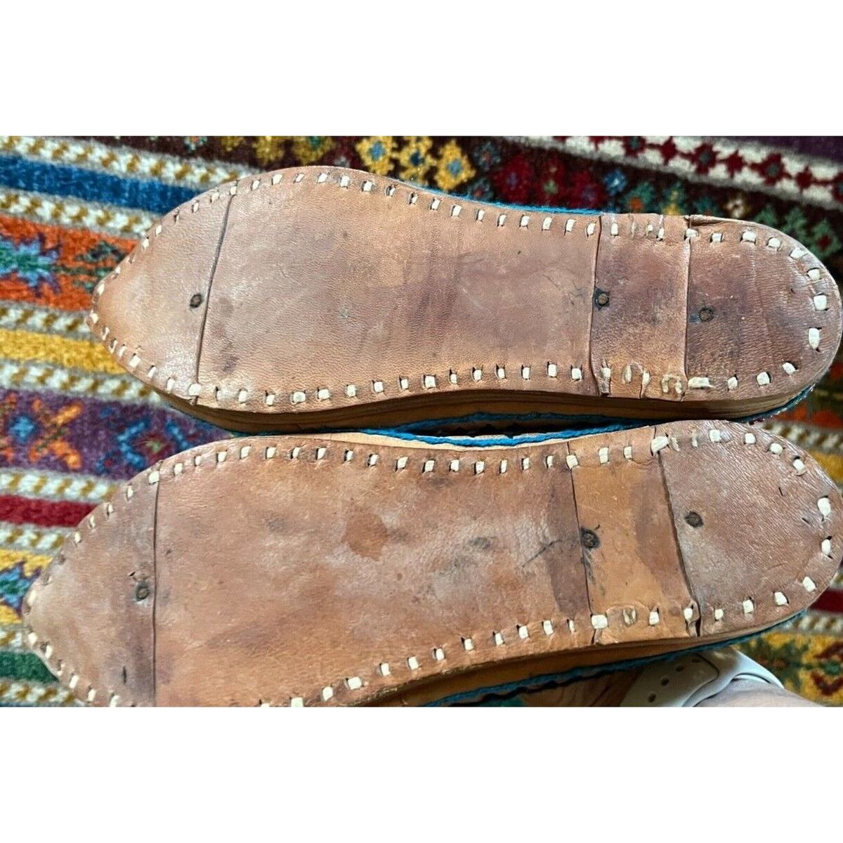 VTG 1970s Embroidered Leather Khussa Slippers Beaded Boho Folk Shoes