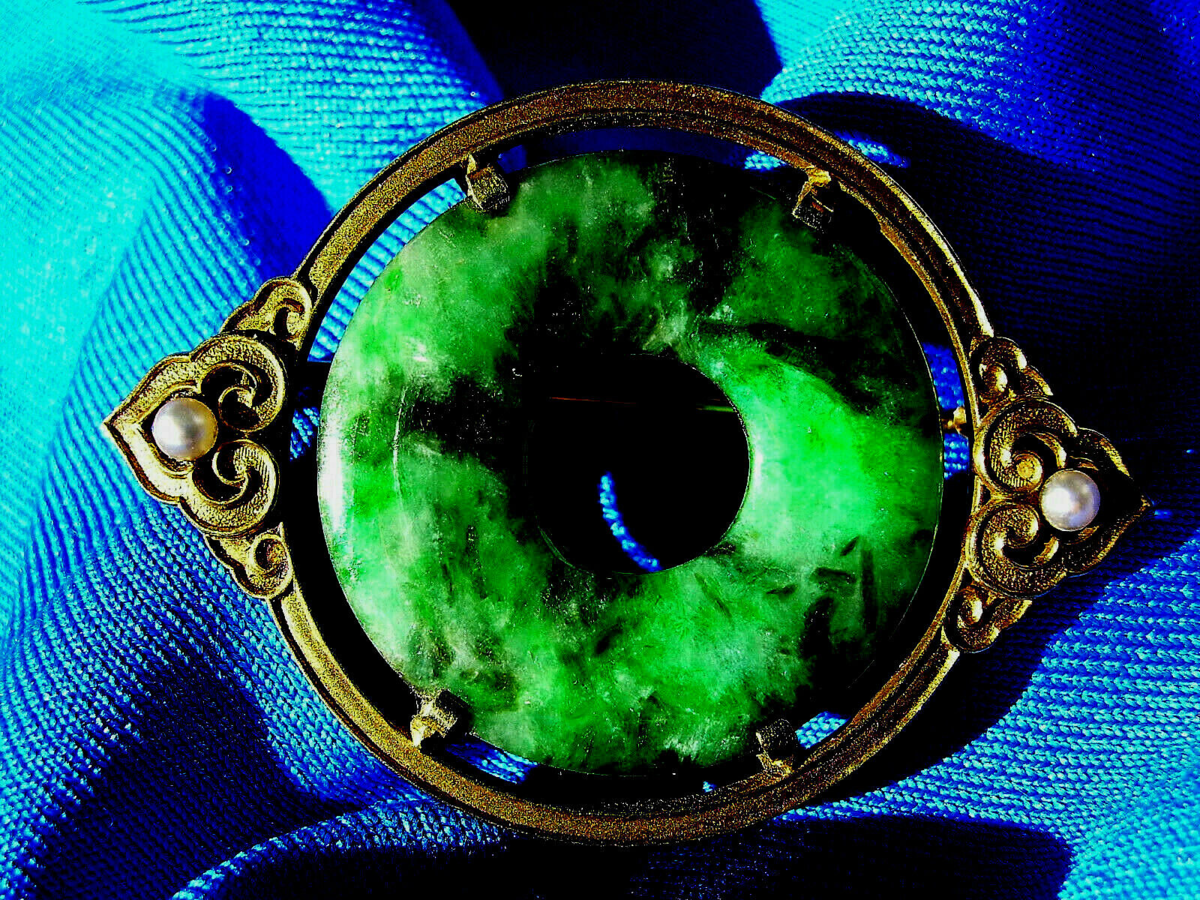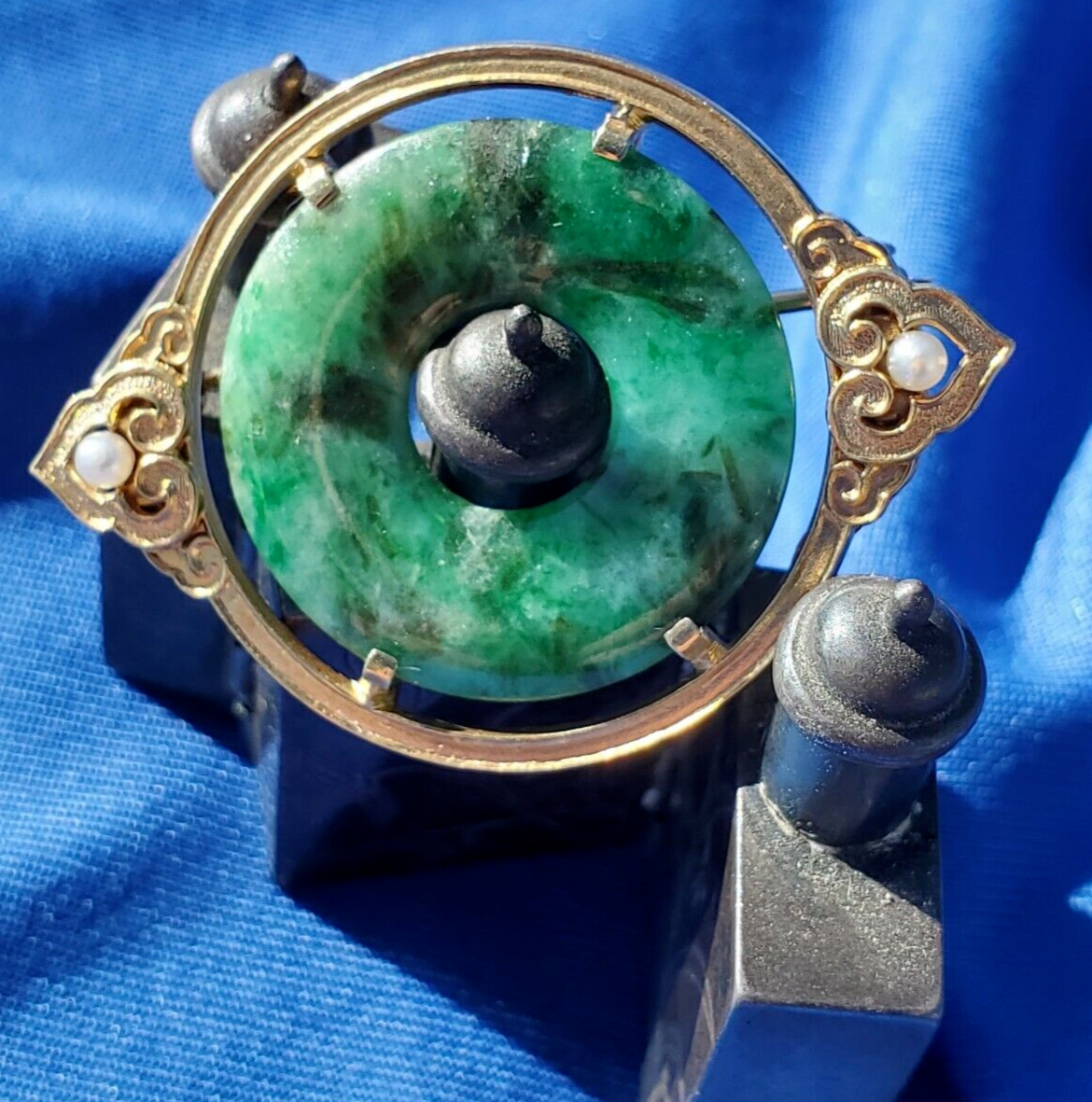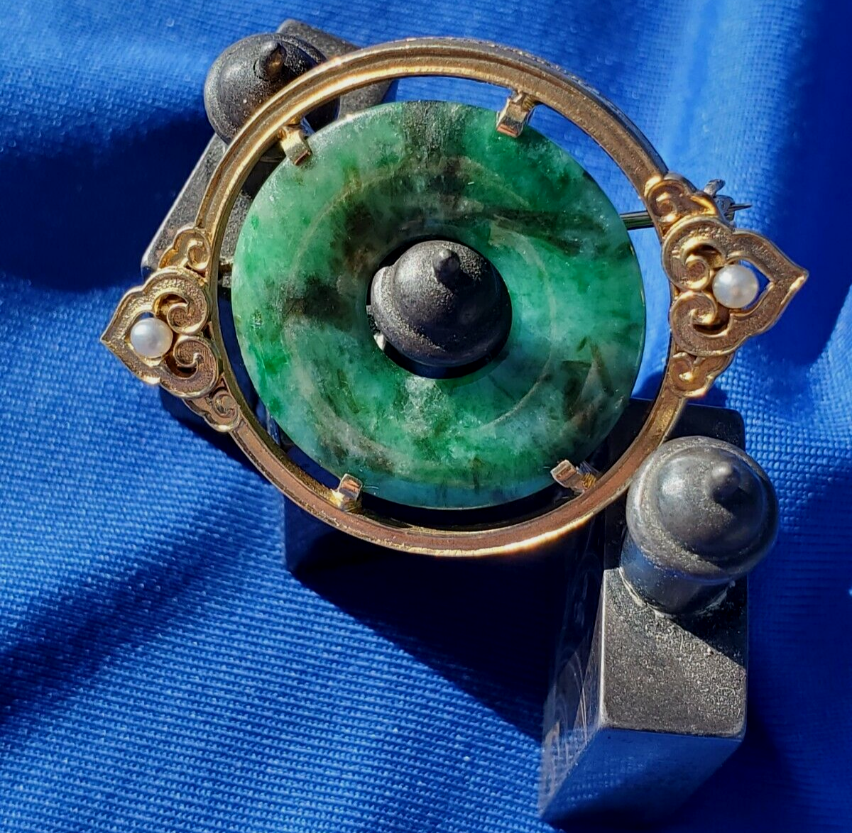 NATURAL EARTH MINED JADEITE JADE PEARL 14K GOLD ORIGINAL GATSBY ERA BROOCH.