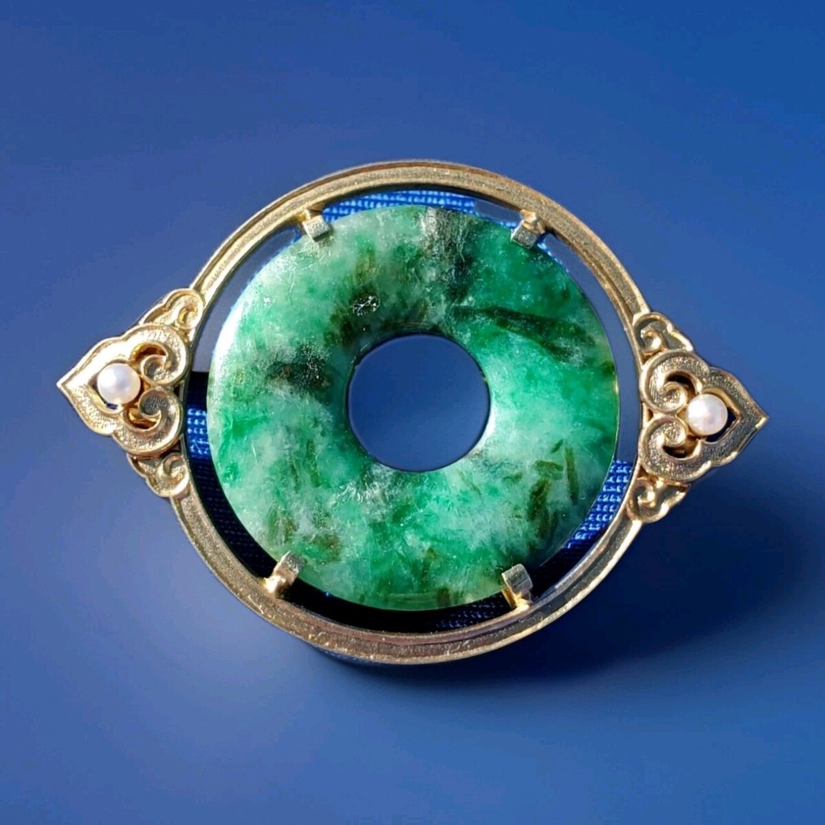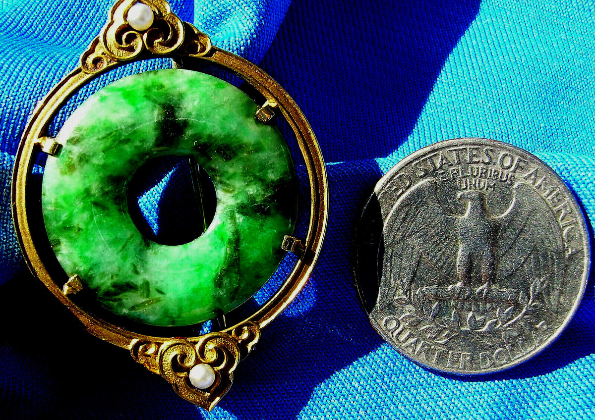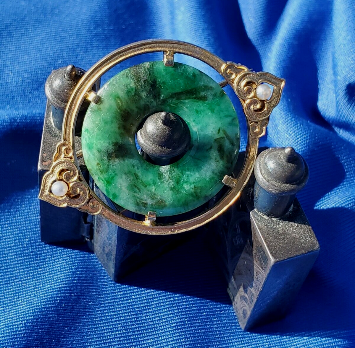 NATURAL EARTH MINED JADEITE JADE PEARL 14K GOLD ORIGINAL GATSBY ERA BROOCH.