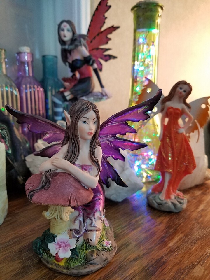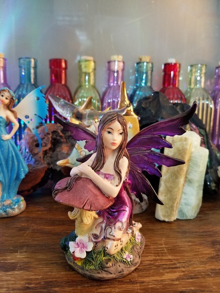 Purple Fairy Pixie Resting by a Mushroom / Purple Winged Fantasy Figurine