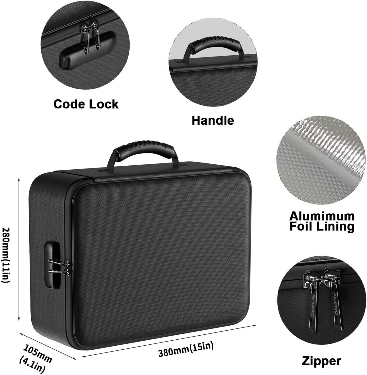 Features: Portable,Waterproof,Fireproof,Water-resistant,Large Capacity,Adjustable Sections,Combination Lock,Zipper Closure