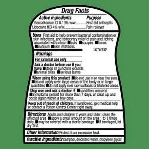 0.13% Benzalkonium Chloride: A first-aid antiseptic that helps prevent bacterial contamination and skin infections.