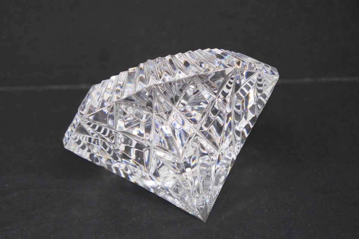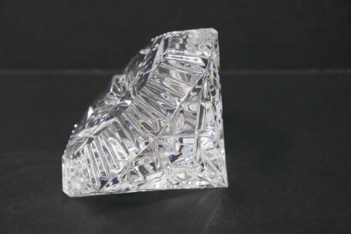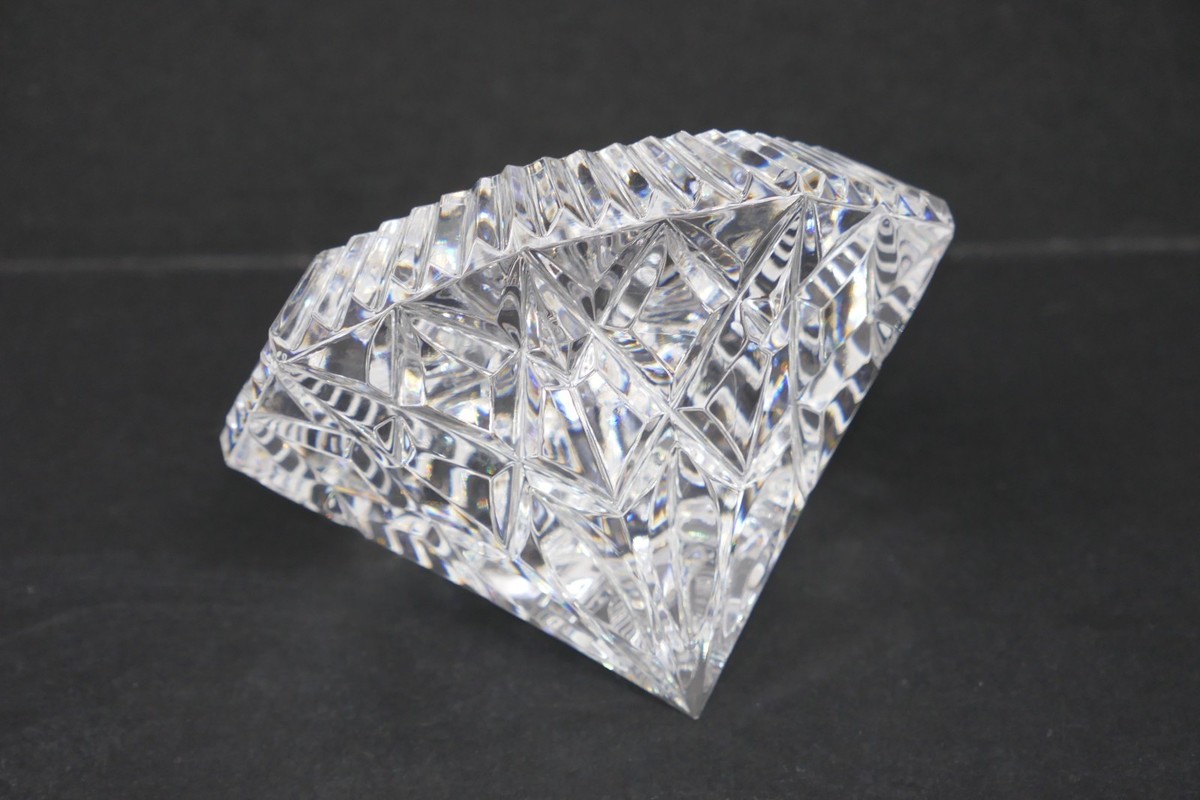 The Waterford Crystal Lismore Diamond Paperweight is a stunning piece of contemporary art glass, featuring a Lismore Diamond, featuring radiant diamond and wedge cuts. This measures approx. 3" wide and 2" tall with no chips or cracks, the bottom does have a few small scuffs or scratches. Made of clear crystal and crafted in Ireland by Waterford, this original paperweight is a decorative and stylish addition to any home decor. The intricate design and high-quality craftsmanship make it a timeless and elegant piece that exudes sophistication and charm. Perfect for collectors or as a luxurious gift, this paperweight is sure to be a cherished treasure for years to come.