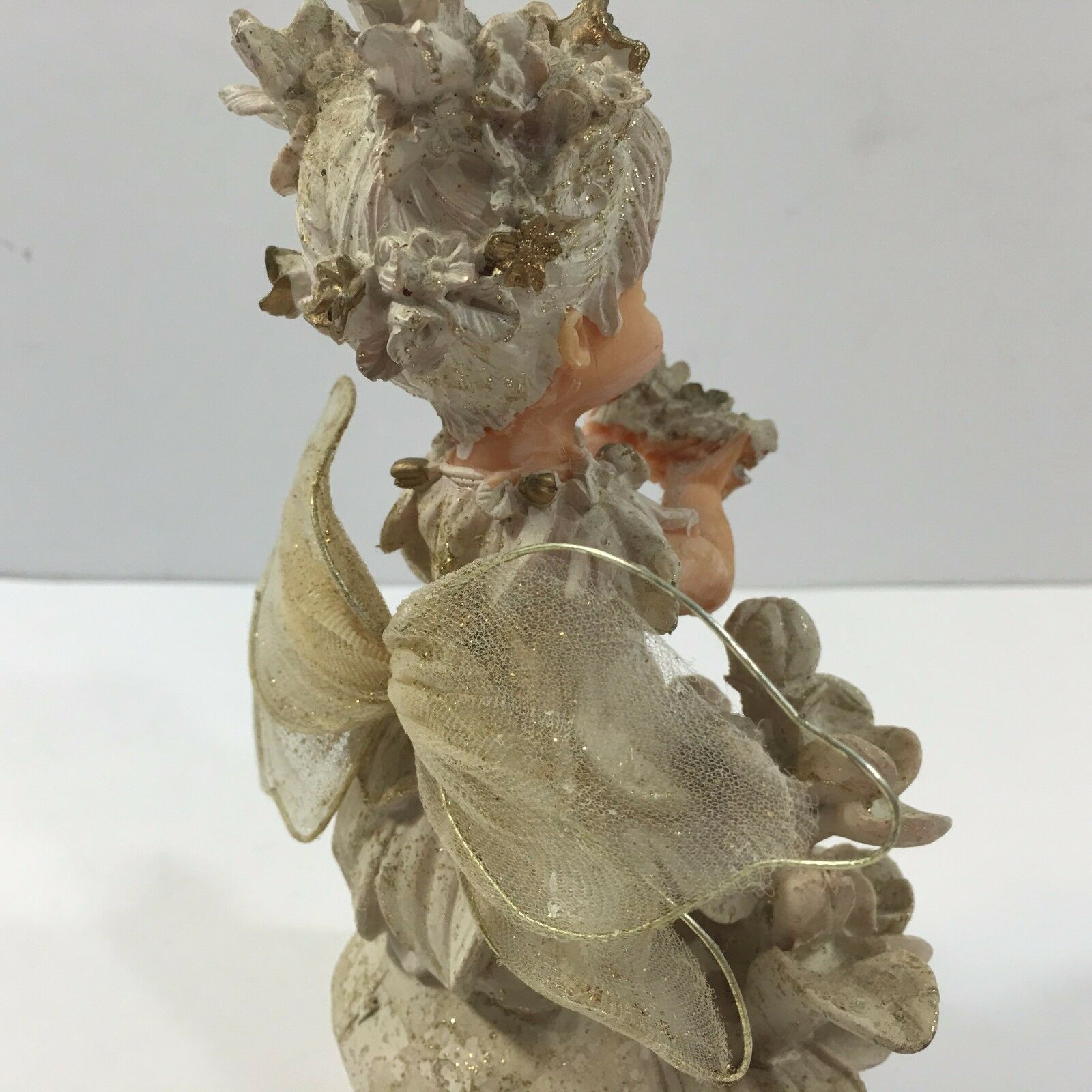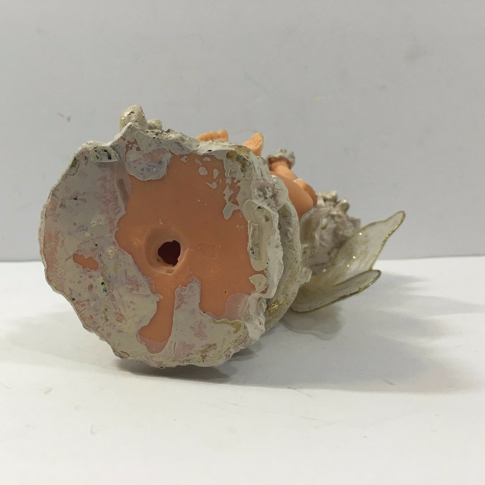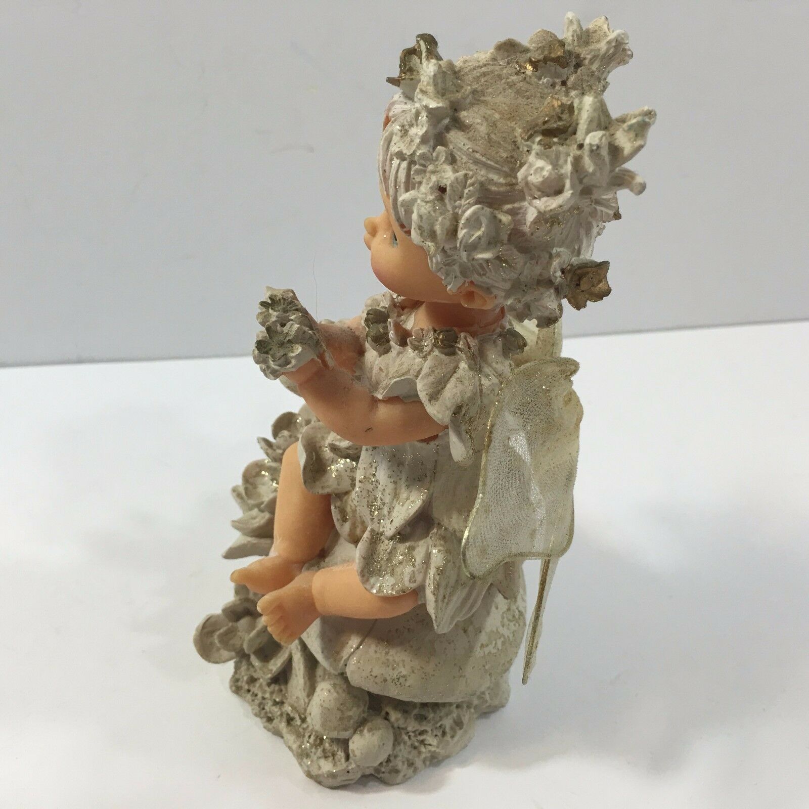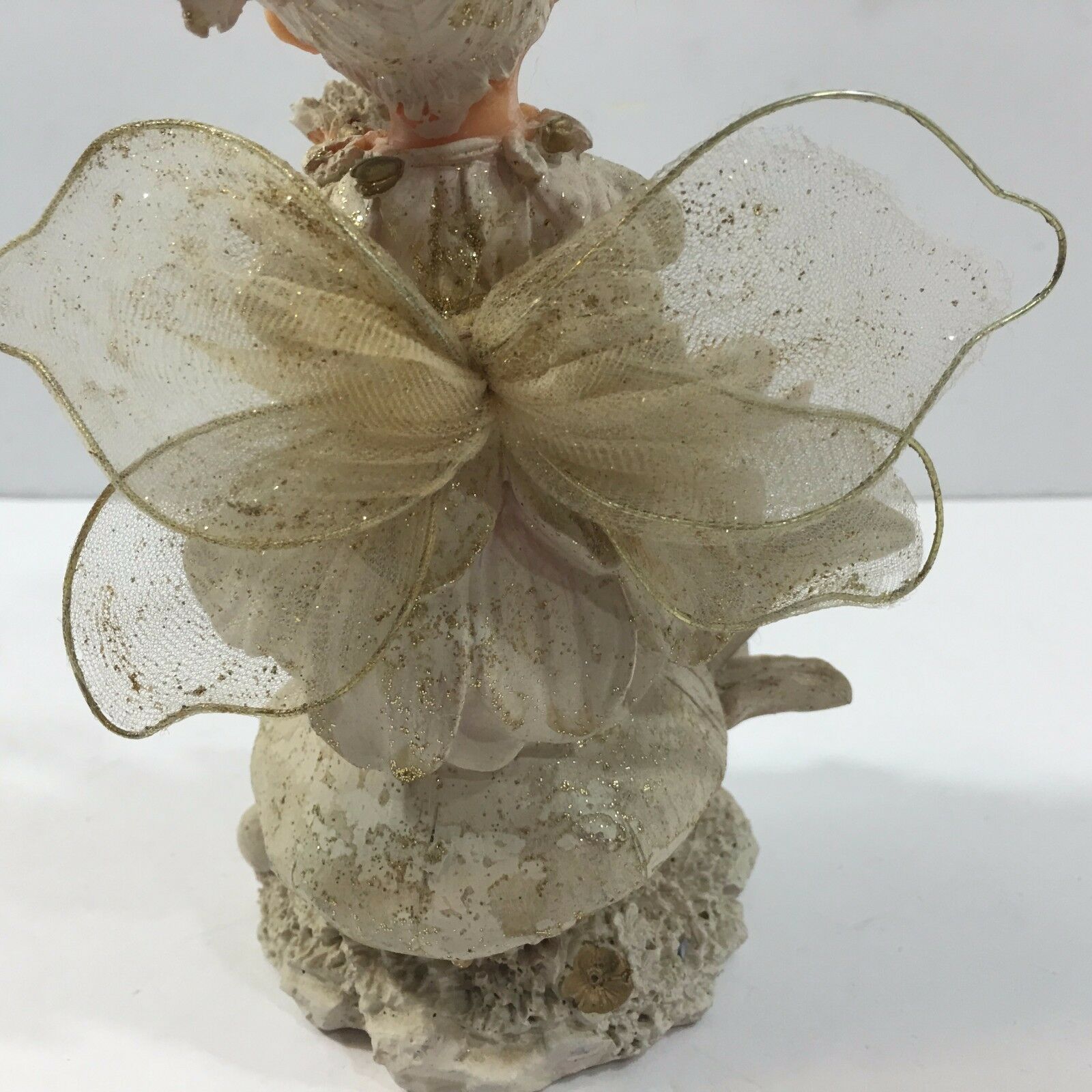 With delicate wings, originally plastic doll, the material seems papier-mache like.