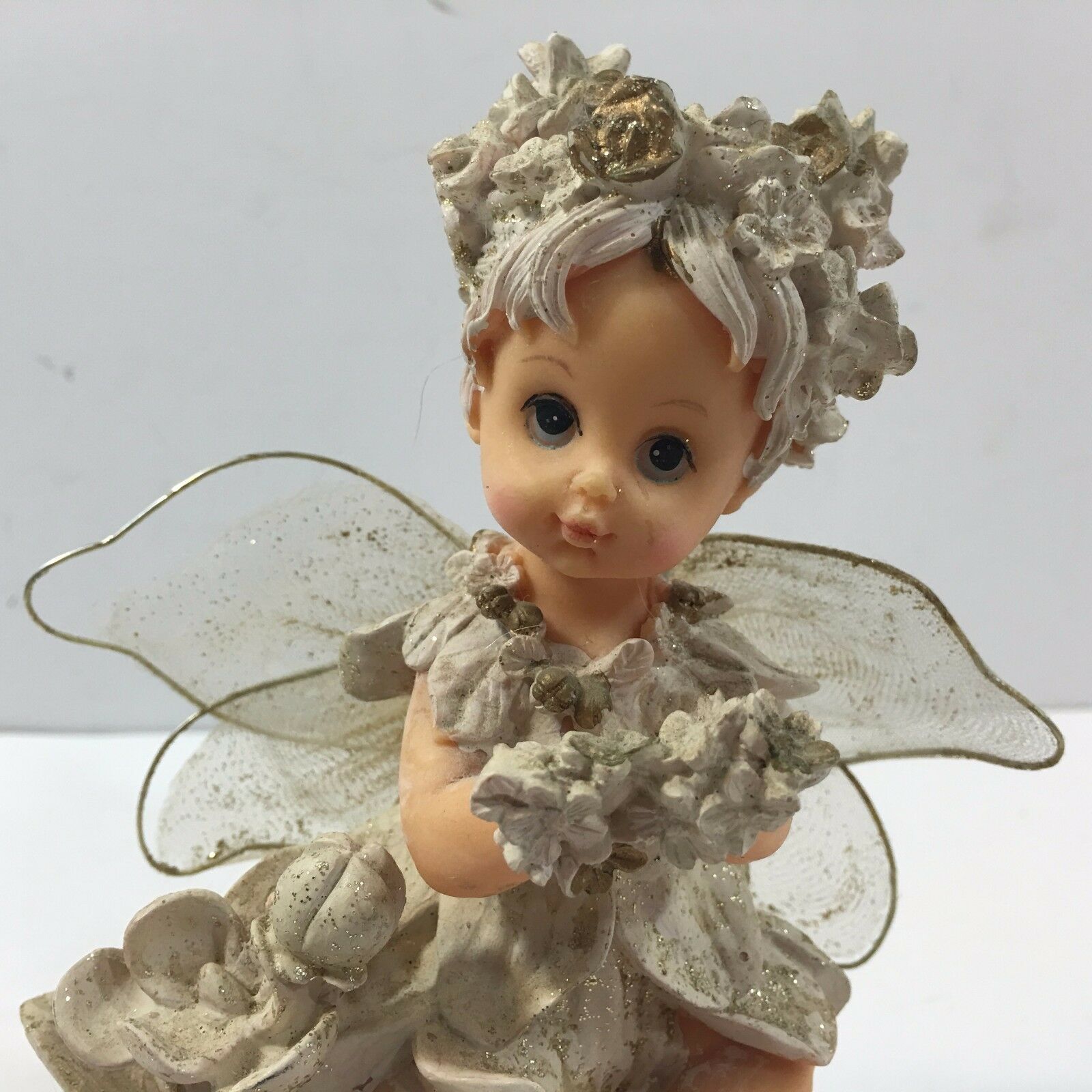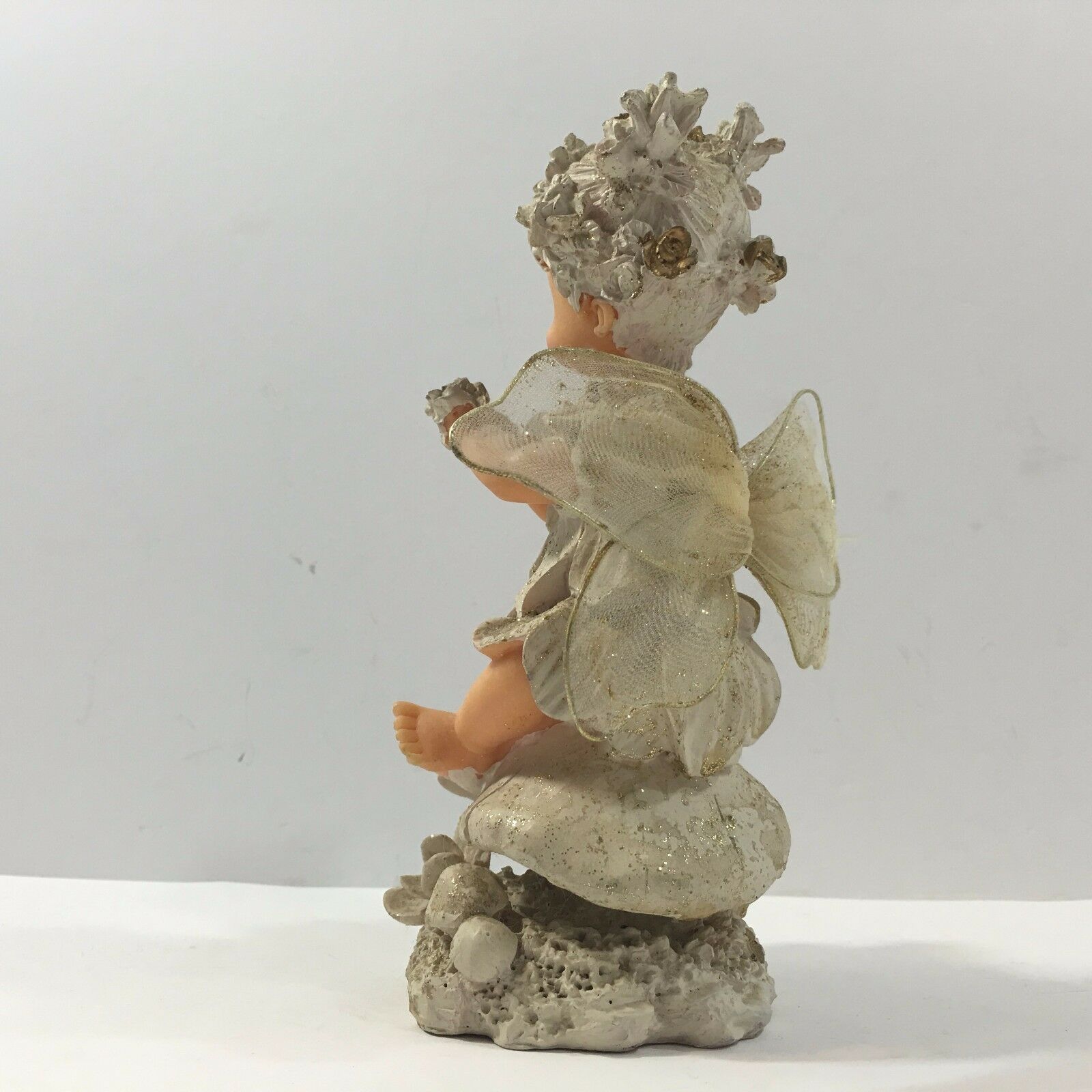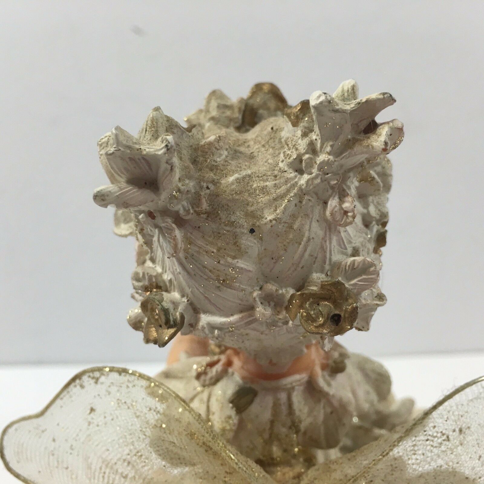 With delicate wings, originally plastic doll, the material seems papier-mache like.