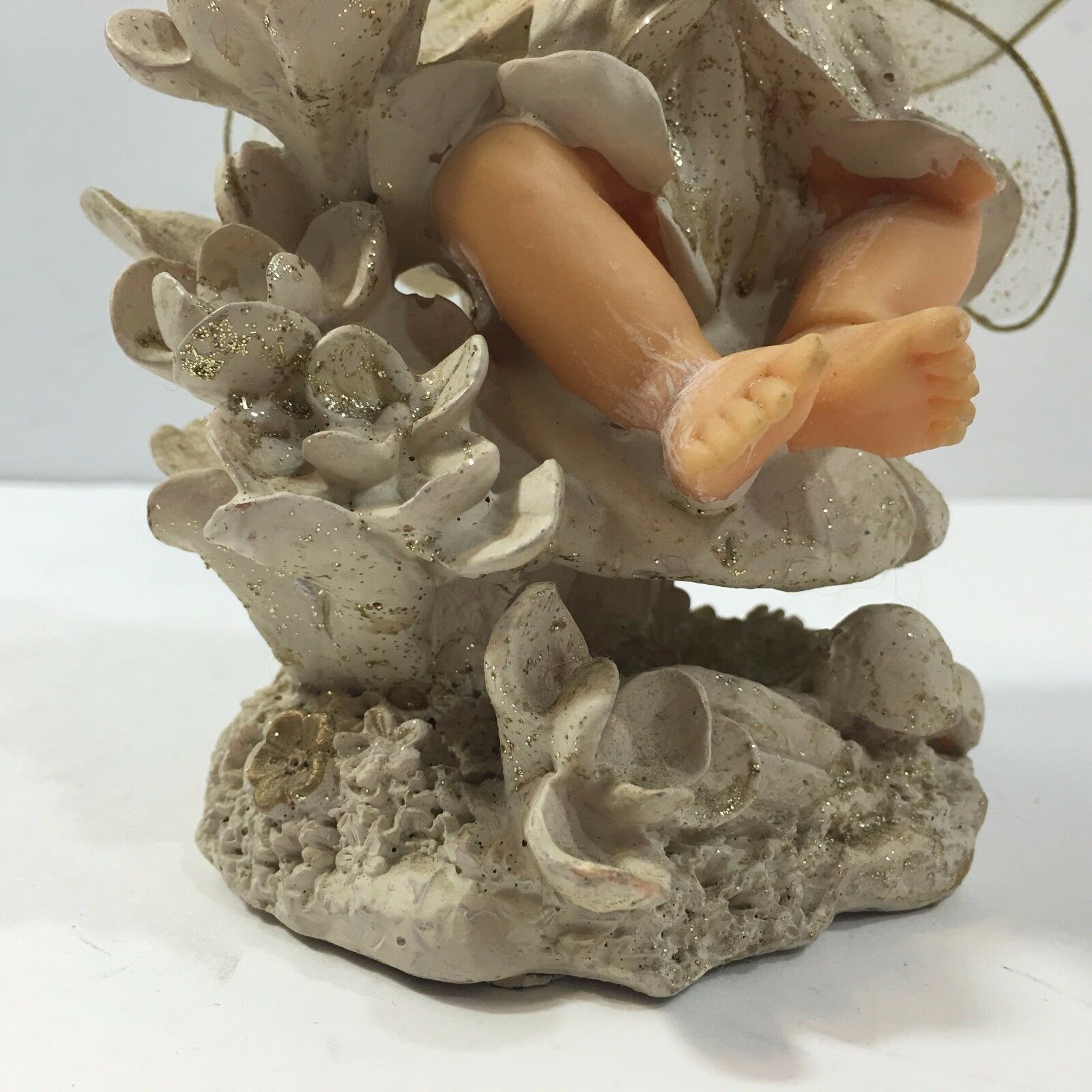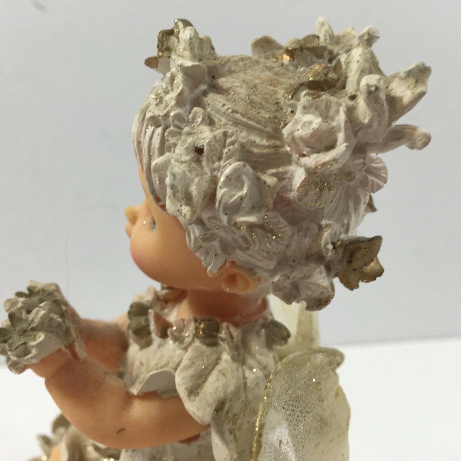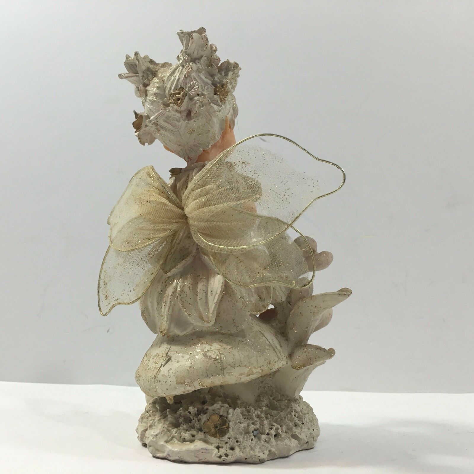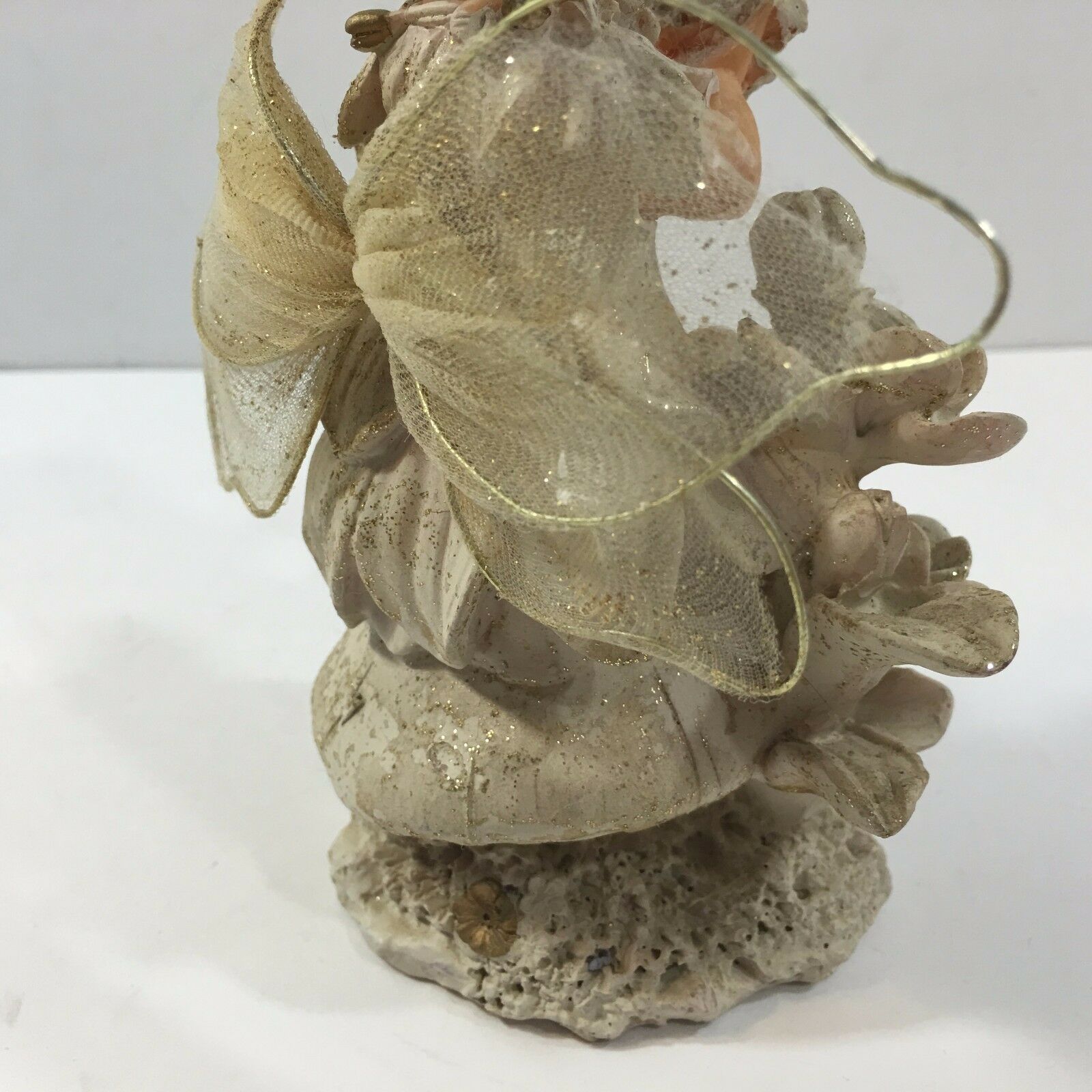 With delicate wings, originally plastic doll, the material seems papier-mache like.