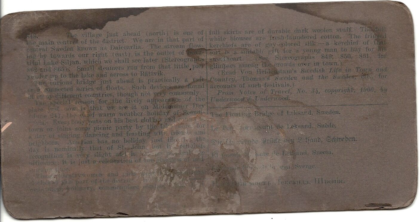 Stereoview Slide Card Floating Bridge of Leksand, Sweden 1906