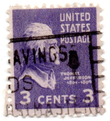 This item is a collectible United States postage stamp featuring a portrait of Thomas Jefferson, originally issued as part of the 1938 Presidential series, also known as the "Prexies".