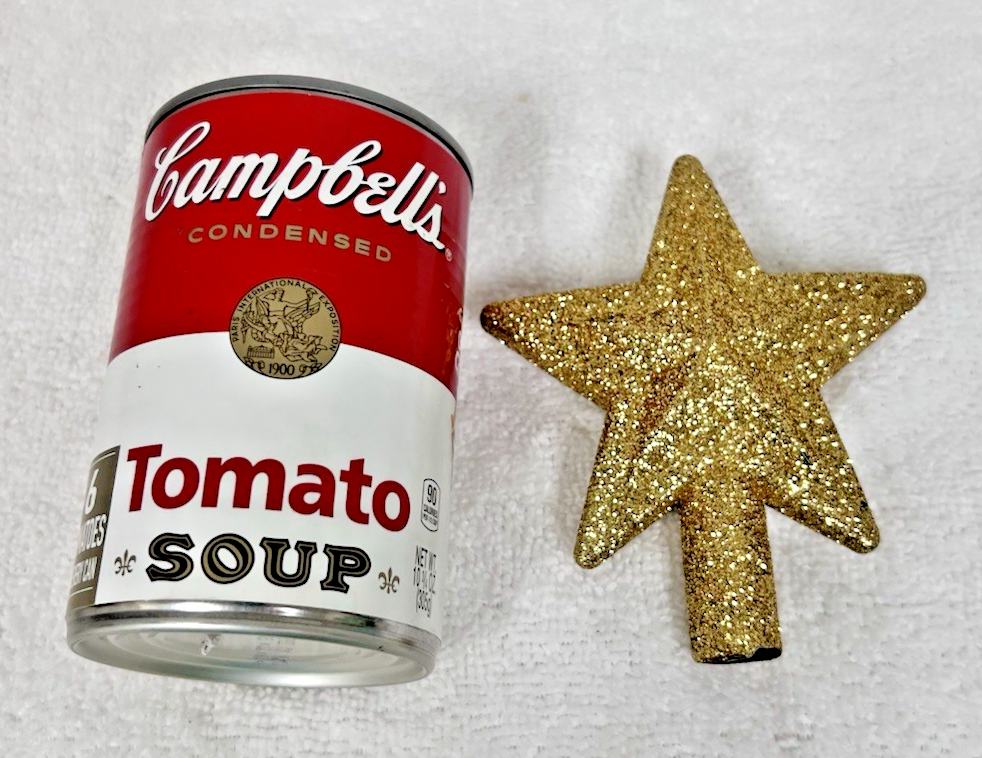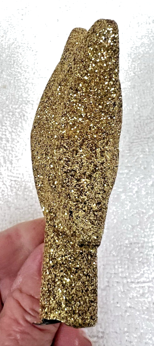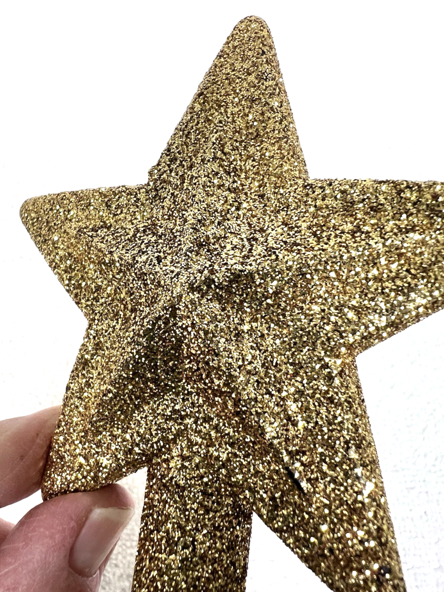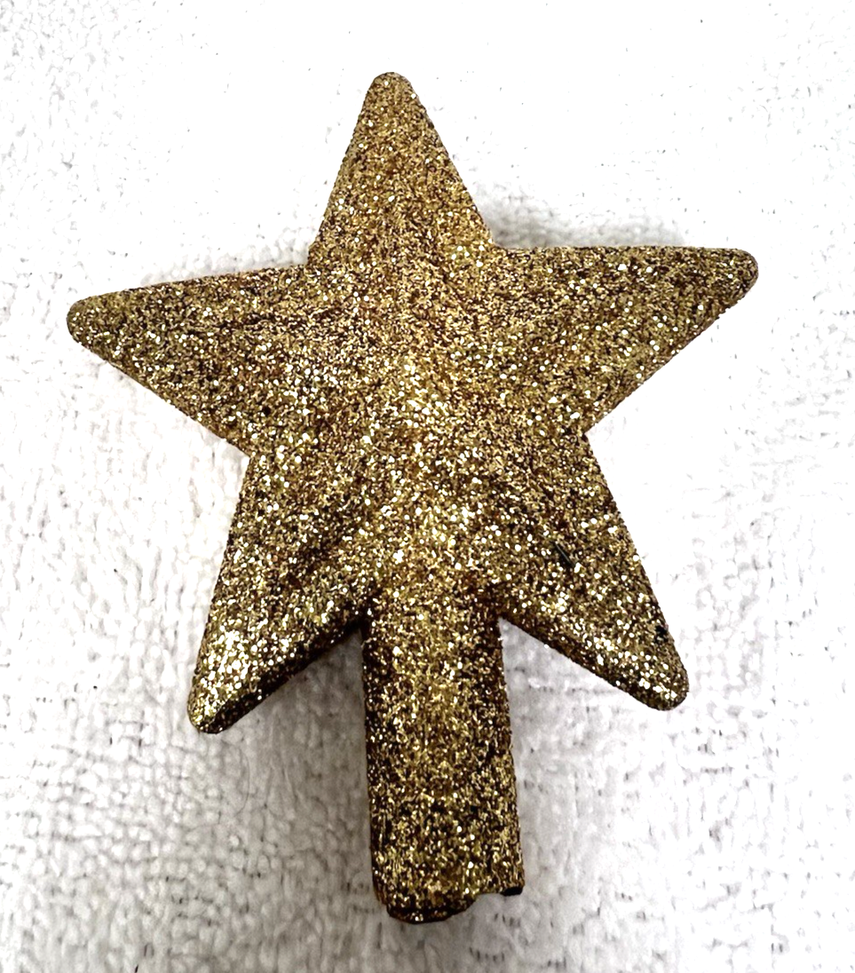 Christmas Plastic Gold Glitter Star Shaped Tree Topper 4 1/2" Tall. Gold glitter star tree topper measures approx. 4 1/2" tall and 3 3/4" wide, no damage, gold glitter in very good condition. See pictures.