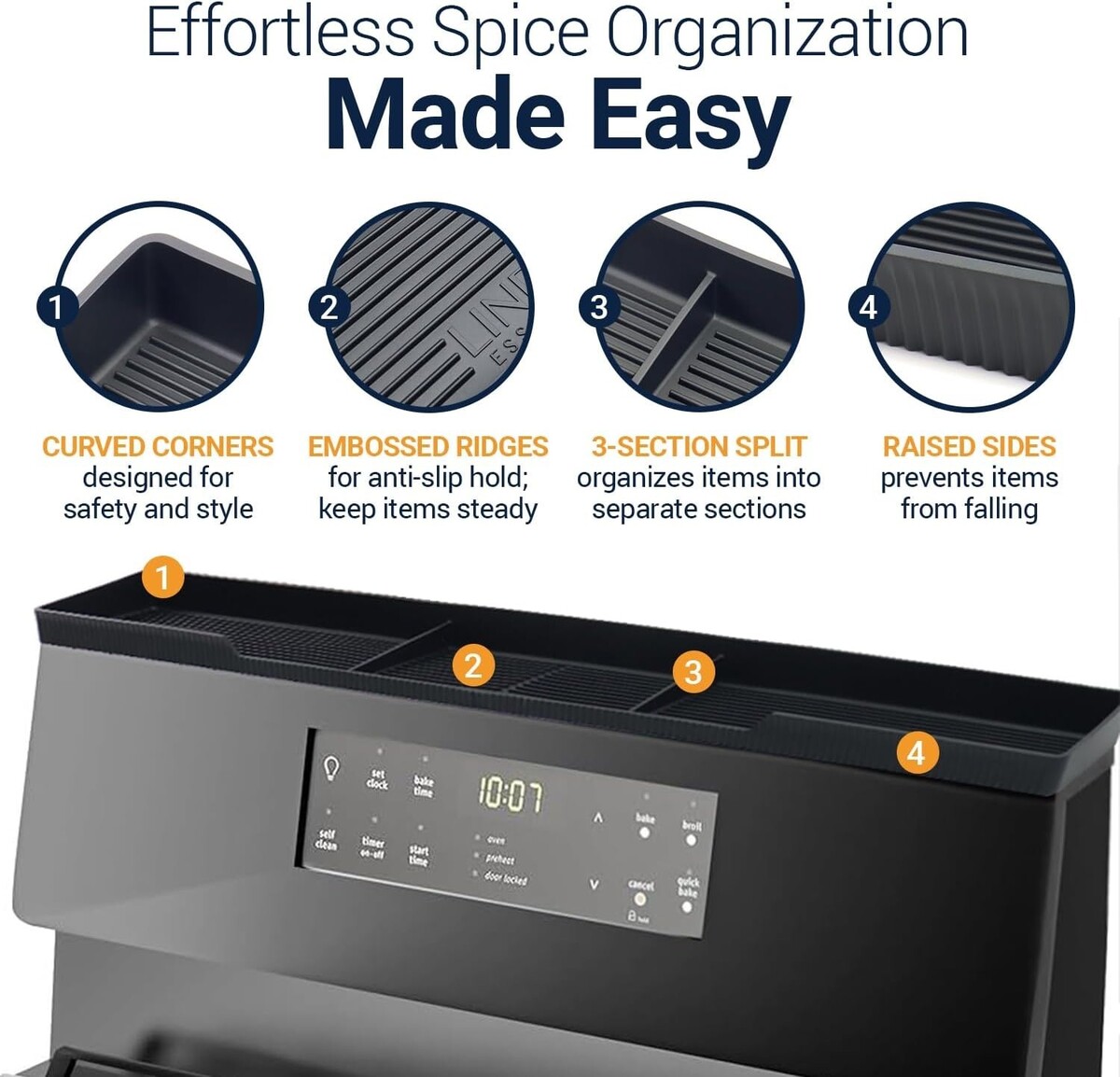 Enhanced Organization: Featuring subtle ridges that create three sections, our shelf promotes effective organization of condiments, spices, oils, and decorative items.