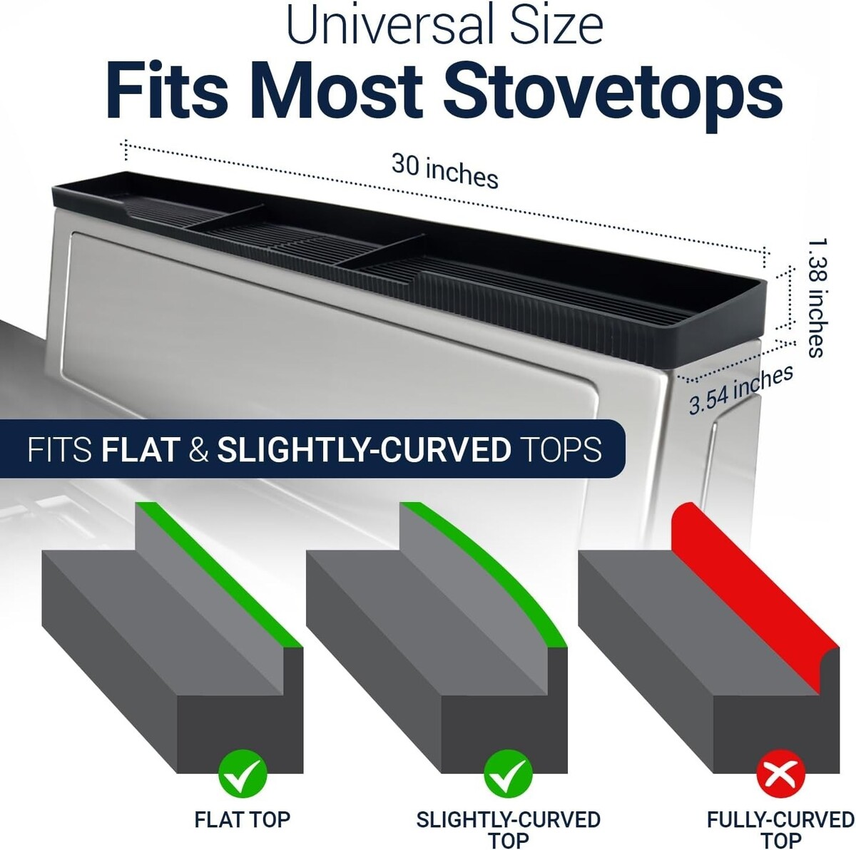 Ideal Dimensions: Designed as a 30" shelf, our organizer fits most flat and slightly curved stoves. Remember to measure your stove before ordering to ensure a perfect fit. Refer to our detailed images for sizing guidance.