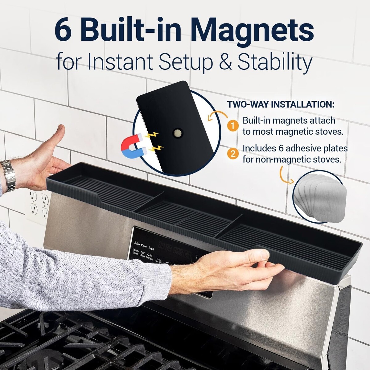 Quick Installation: Enjoy a seamless setup with no tools required! Our shelf features 6 built-in magnets for secure attachment to most stovetops. For non-magnetic surfaces, we provide 6 adhesive plates, ensuring universal compatibility.