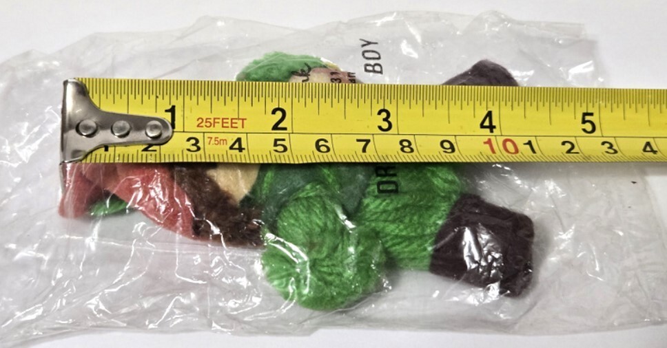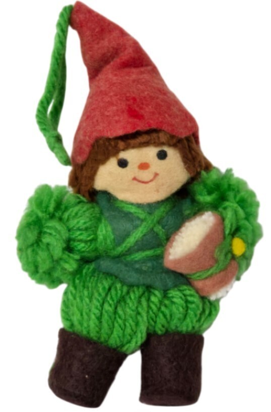 Material: Green and red yarn/felt with a soft pom-pom texture and a knit-style body.