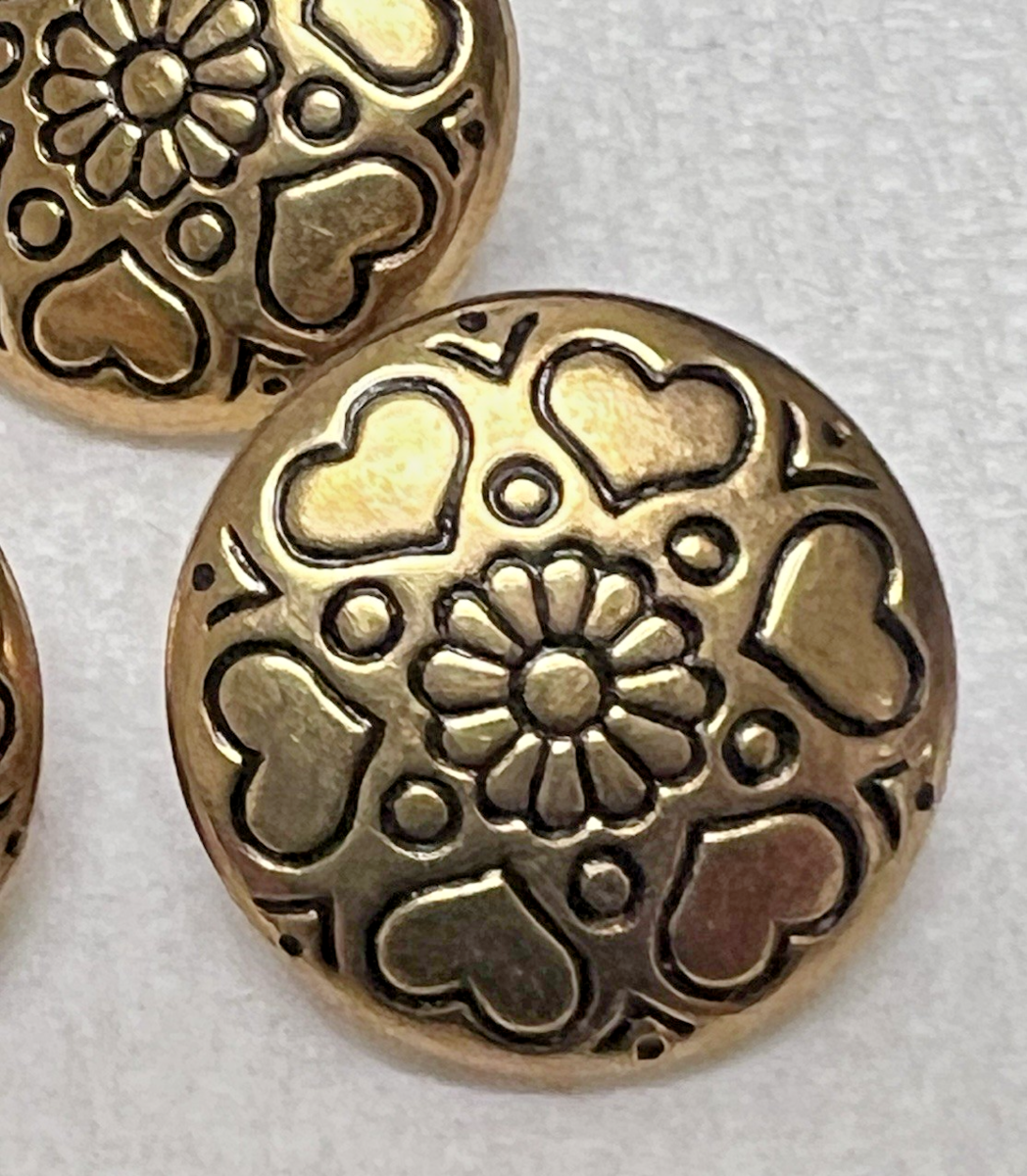 3 Vintage Gold Tone Metal Round Hearts & Flower Dome Buttons 5/8 inch