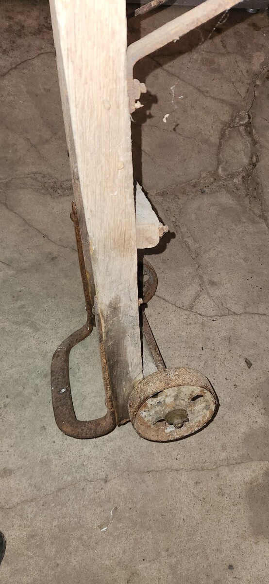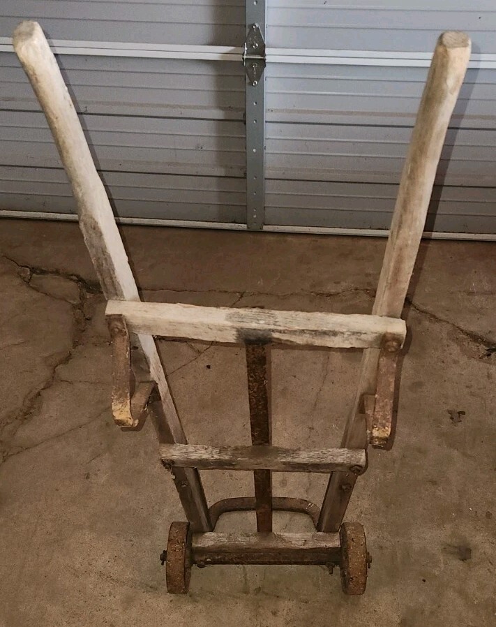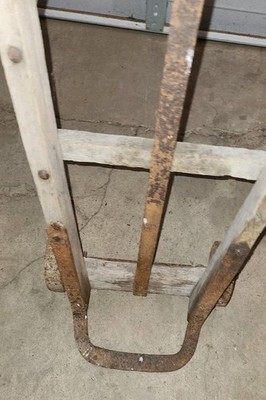 Vintage wood and steel heavy hand truck. Dolly cart. Feed sacks. Barrels. etc.