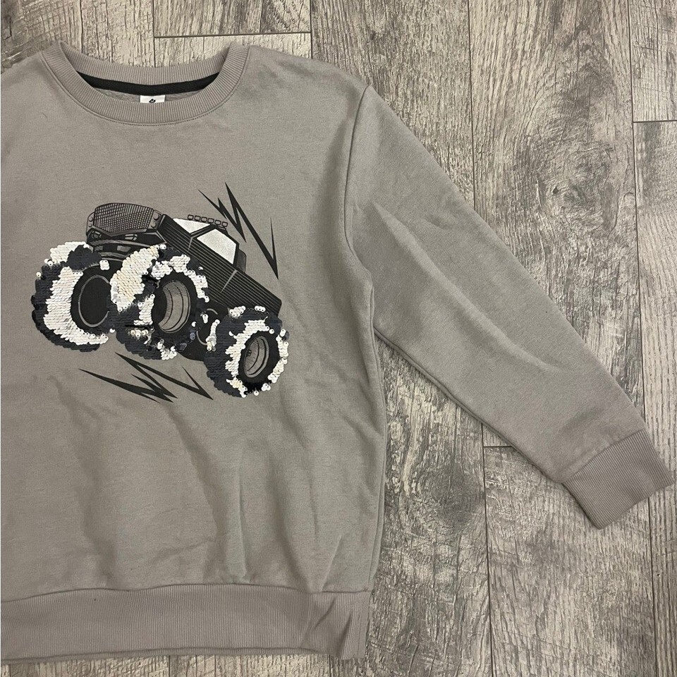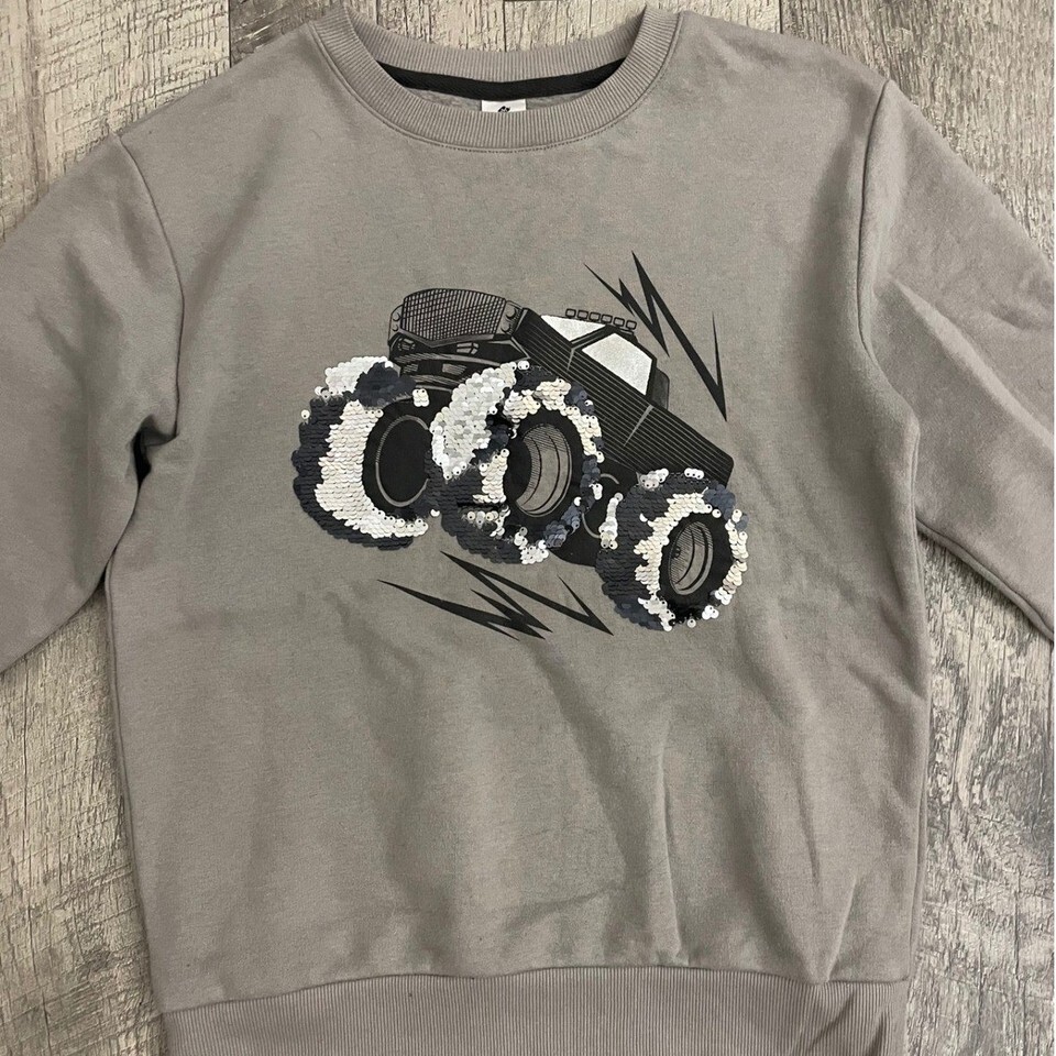 Members Mark Boys Monster Truck Sequin Sweatshirt Gray Pullover Size 10/12
