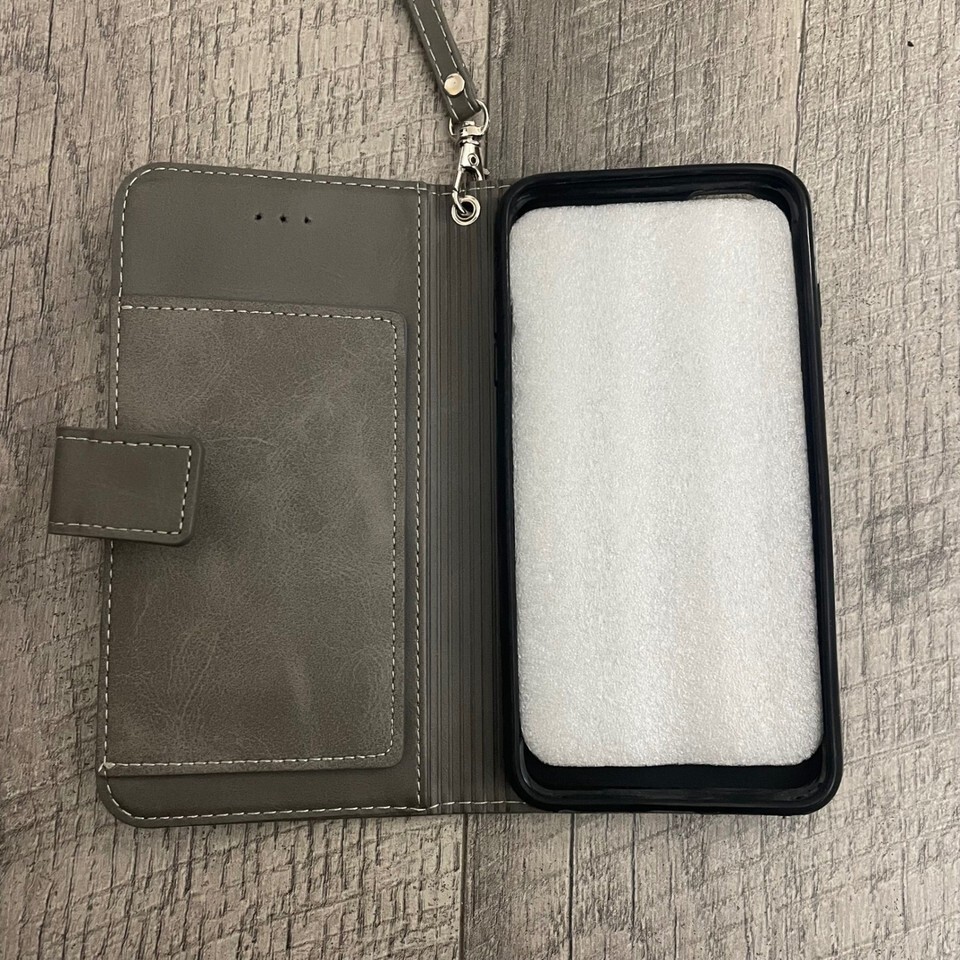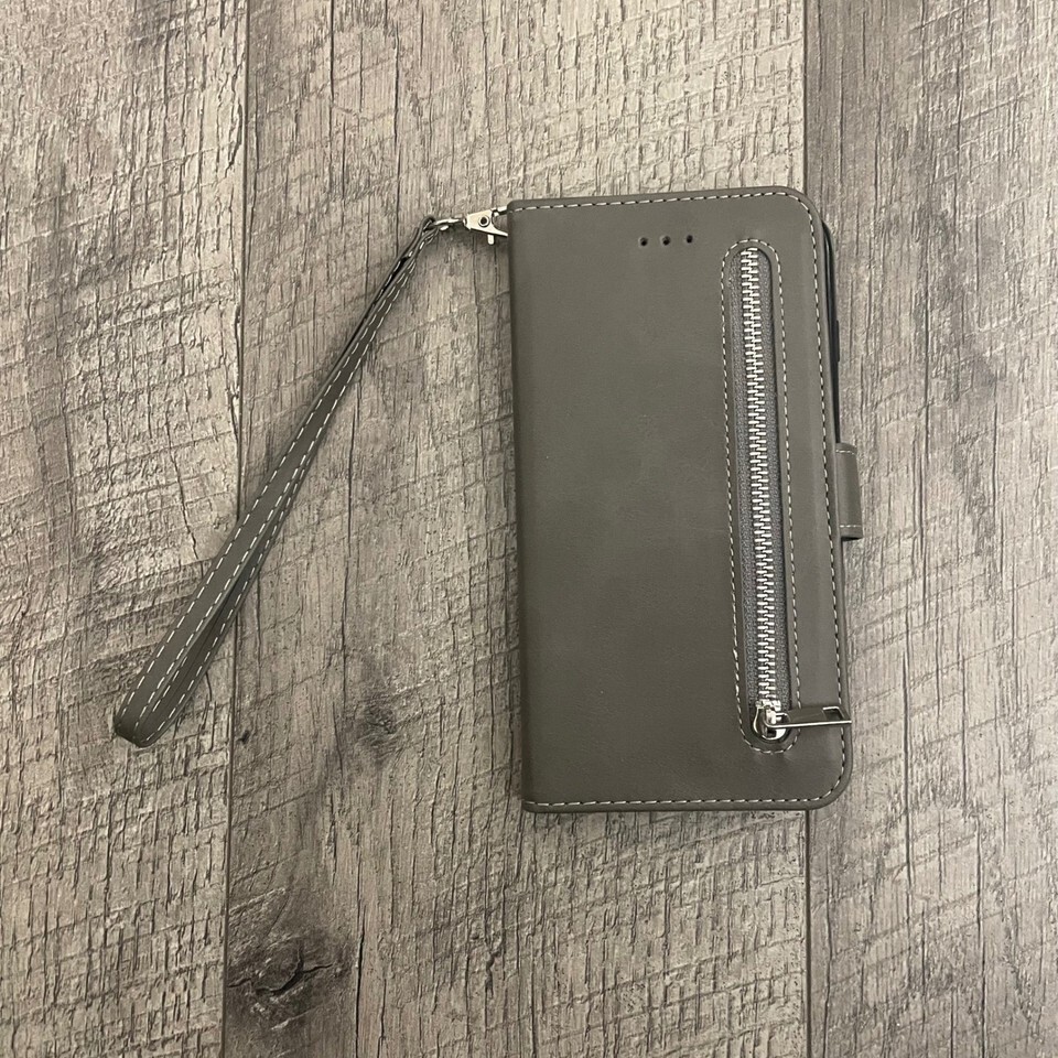 Grey Faux Leather Wallet Phone Case with Zipper Pocket and Wristlet Strap