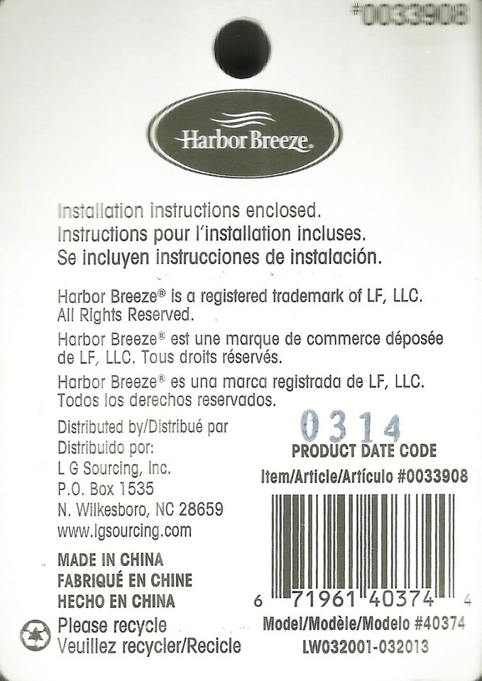 | HARBOR BREEZE ITEM NUMBER: |