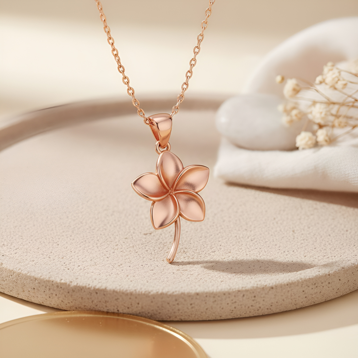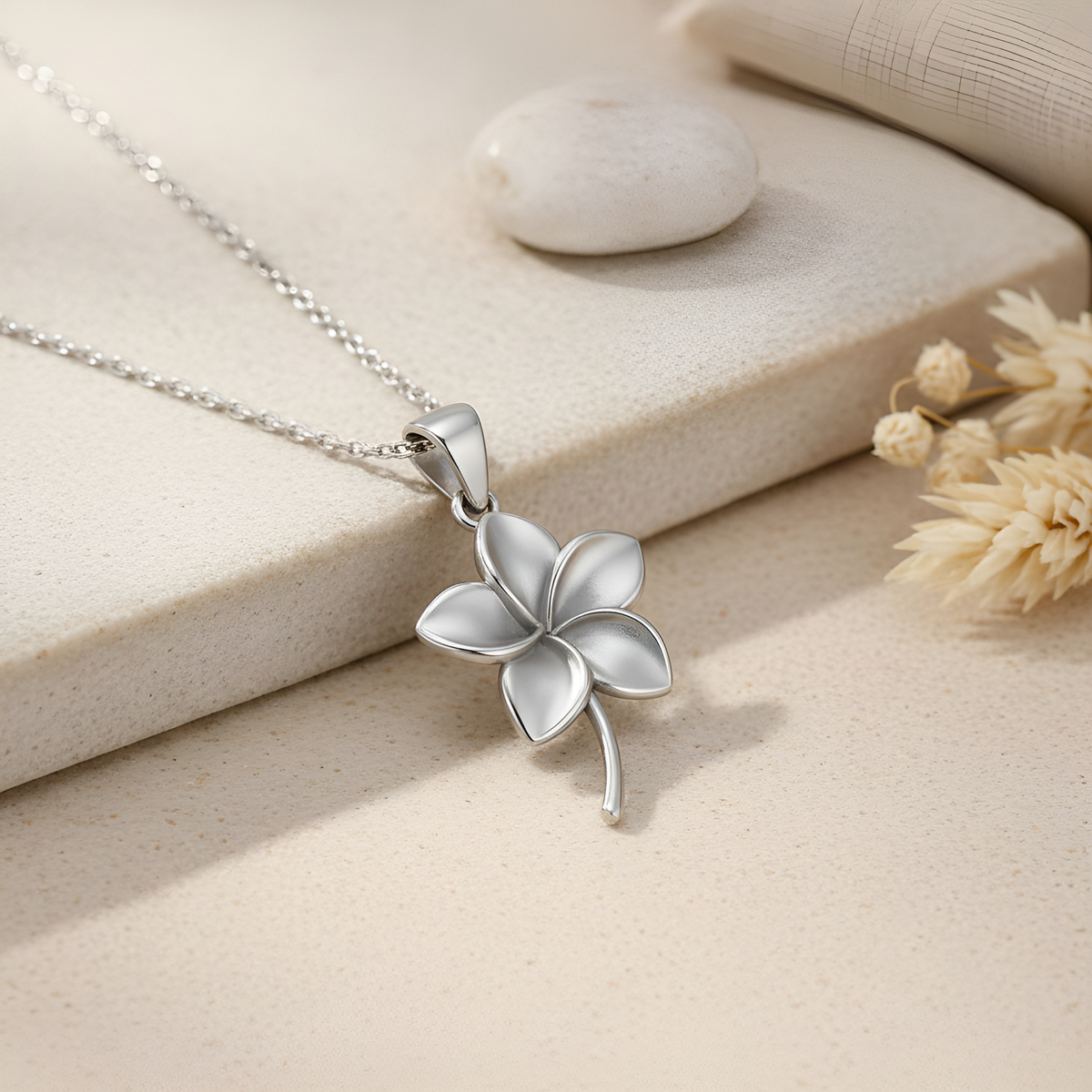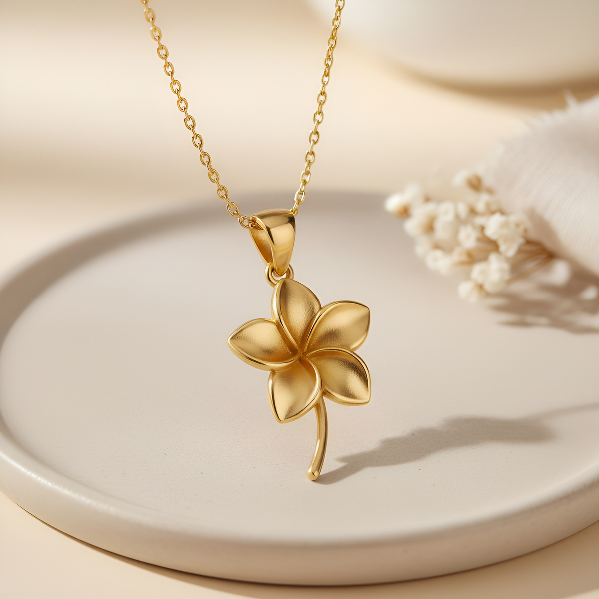 This Plumeria flower pendant necklace brings together botanical jewelry, handmade craftsmanship, sterling silver artistry, and tropical floral symbolism to create a serene and elegant piece. The Plumeria flower is cherished across many cultures for representing grace, renewal, harmony, and inner peace. Its soft, rounded petals and gentle natural form convey a sense of calm and effortless beauty, making it a powerful emblem of tranquility and spiritual balance. Handcrafted with a refined 14K gold-plated finish, this piece reflects the warm, radiant glow of tropical blossoms, capturing the soothing essence of island-inspired design. Perfect for women who appreciate meaningful floral motifs, this pendant embodies serenity, feminine elegance, and the refreshing spirit of tropical nature. It serves as a symbolic reminder to embrace peace, celebrate renewal, and carry gentle beauty in everyday moments.