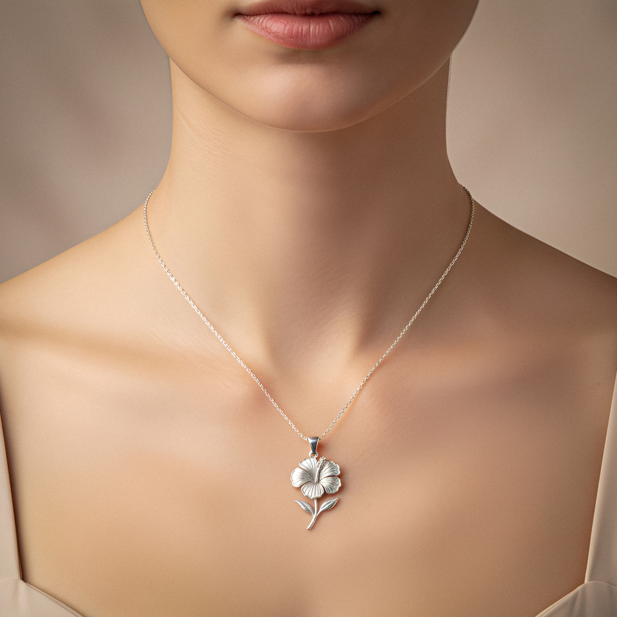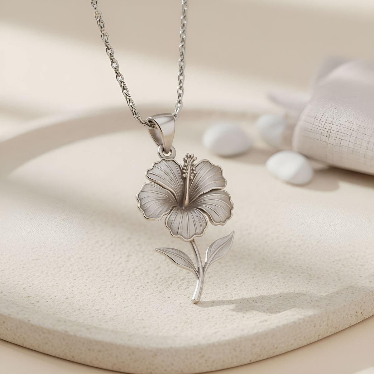 The Hibiscus Flower Pendant Necklace blends tropical floral jewelry, handmade silver craftsmanship, botanical inspired art, and meaningful pendant design into a radiant statement piece. Known for symbolizing vitality, feminine confidence, and warm-hearted charm, the hibiscus flower carries a vibrant spirit that evokes sunshine and joyful energy. This pendant interprets its bold petals with smooth, flowing contours that mirror the natural rhythm of tropical blooms. Each handcrafted detail highlights the flower’s expressive shape, turning it into a refined emblem of beauty, optimism, and lively character. The design celebrates the idea of embracing life with openness and enthusiasm, making it ideal for those who appreciate jewelry that feels bright, uplifting, and emotionally expressive. With its sculpted texture and graceful form, the Hibiscus pendant becomes a wearable reminder of radiant strength and spirited femininity.
