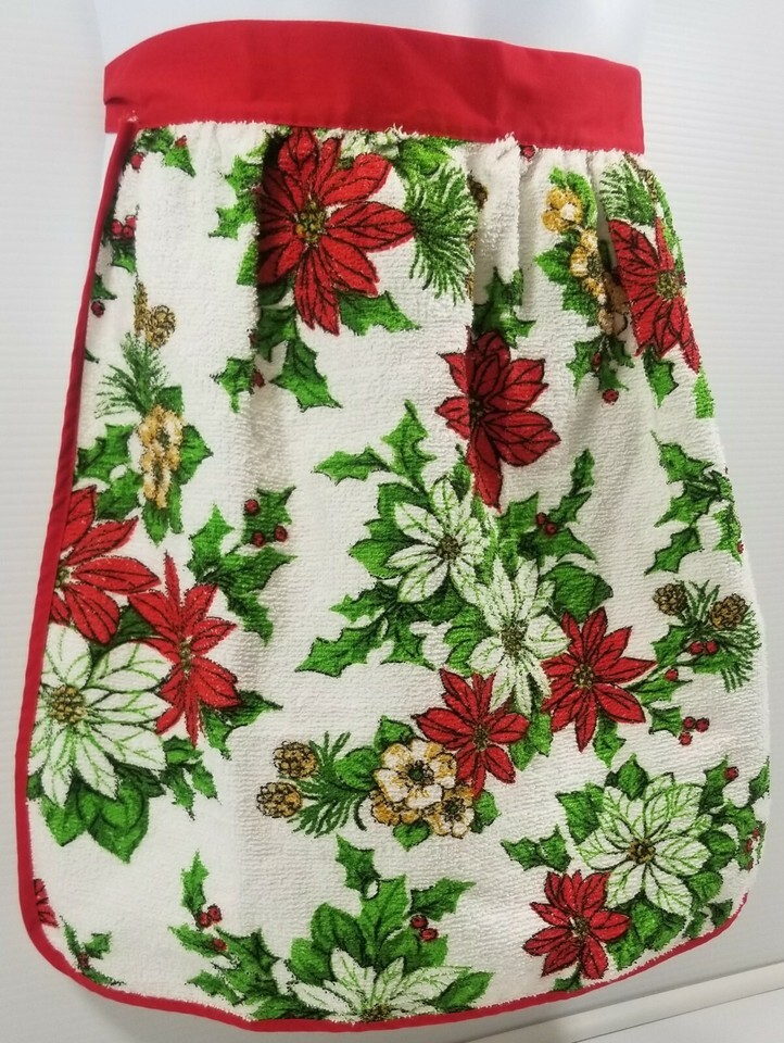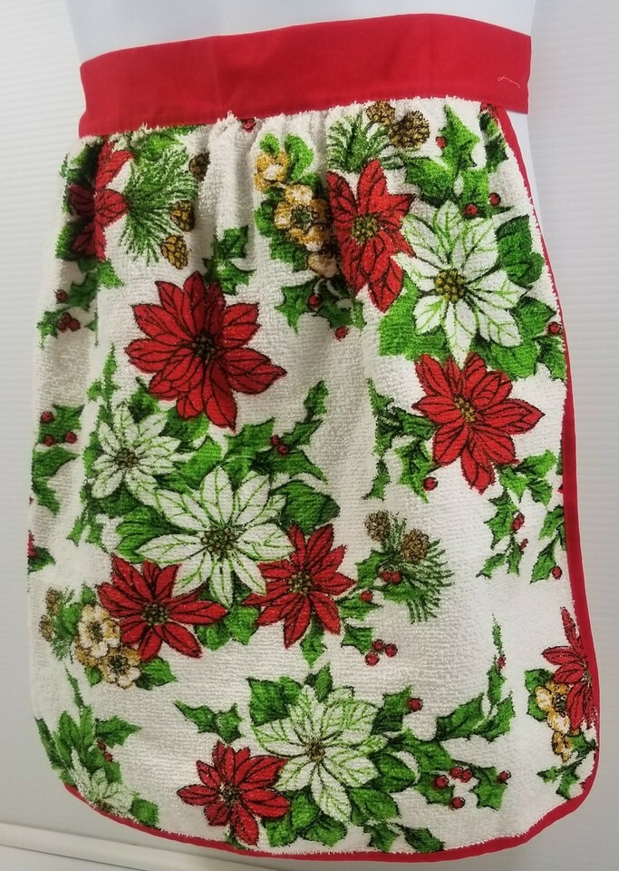 QQ) Vintage Christmas Holiday Apron Holly Poinsettia Floral Towel Red Green