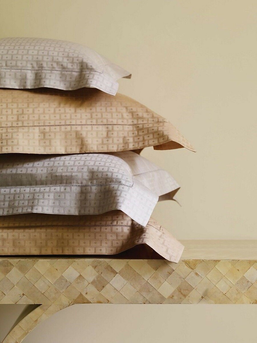 Sferra Leon luxury bedding has a sleek simplicity and has an elegance all its own, that never goes out of style. Expertly woven in Italy of fine Egyptian cotton, our subtle geometric jacquard evokes luxurious parquet tiles centered with a dot. Clean lines, a bit of luminosity, and a decorator's palette of super-neutral colors give these bed linens a special sense of modern luxury. Each piece is finished with our classic hemstitch flange.