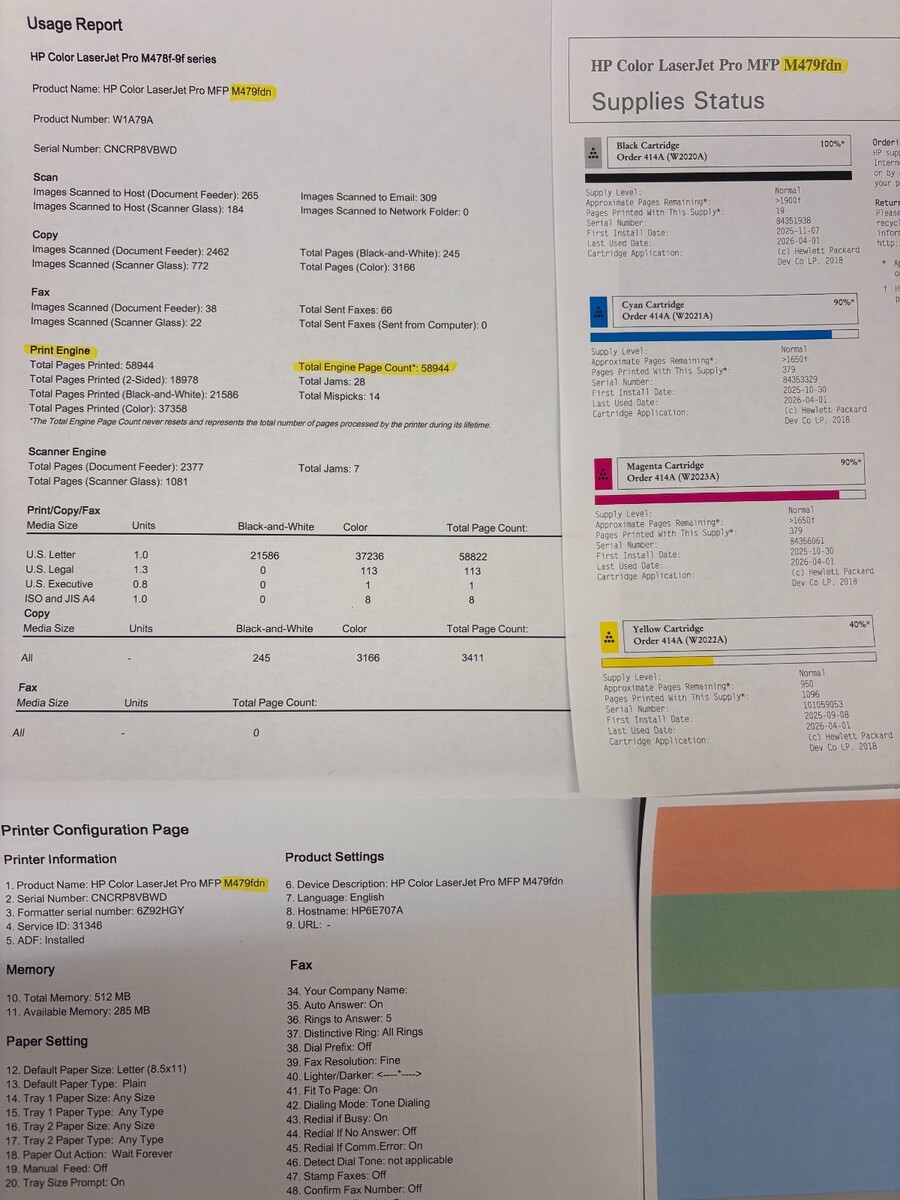 HP LaserJet Pro MFP M479fdn Duplex Color Laser Printer W1A79A Page Count 58k