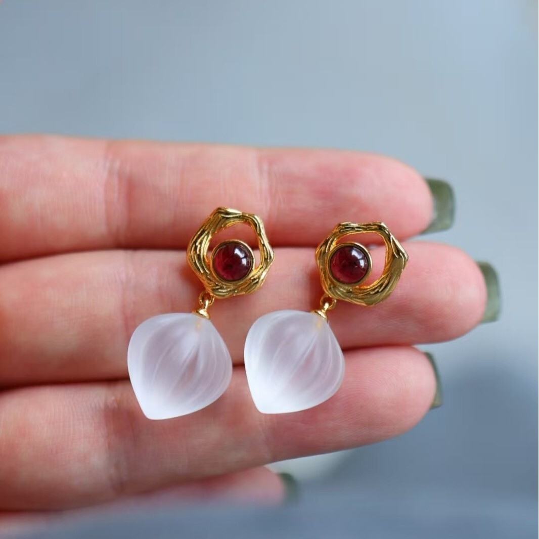 These dangle earrings feature natural white quartz and garnet gemstones. Crafted with 925 sterling silver, the irregular frame design is elegant and unique, suitable for daily wear, office, parties and gifting. Lightweight and comfortable for all-day wear.