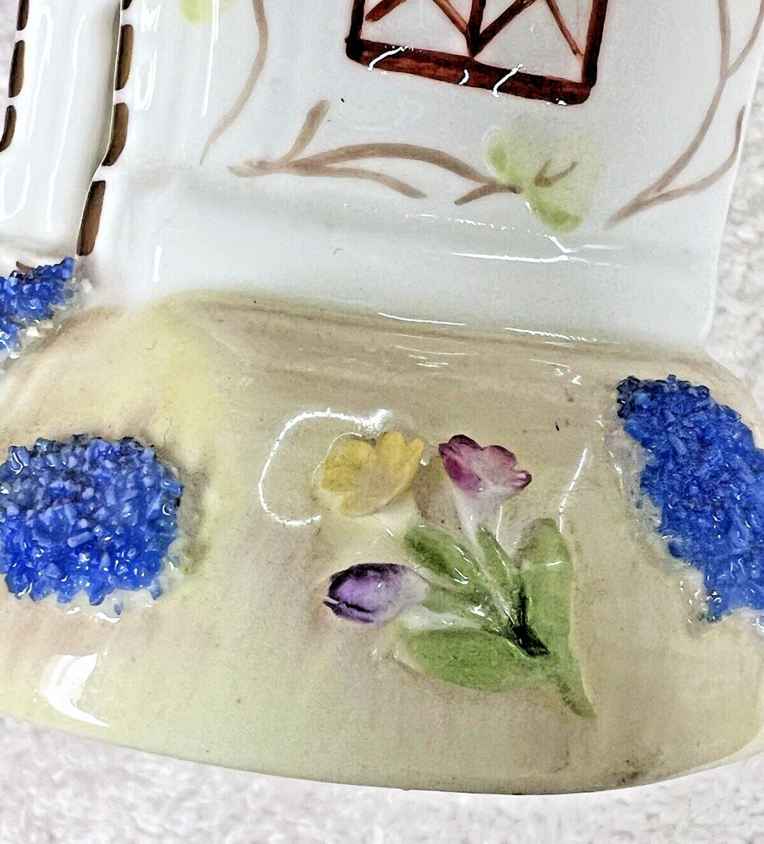 The Toll House by Coalport fine Bone China made in England with spaghetti and applied flowers. 5 inches tall base is 3 1/2 x 2 3/8 no chips or breaks we know it was made for incense however I don?t think it was ever used it?s in very nice shape, please see pictures