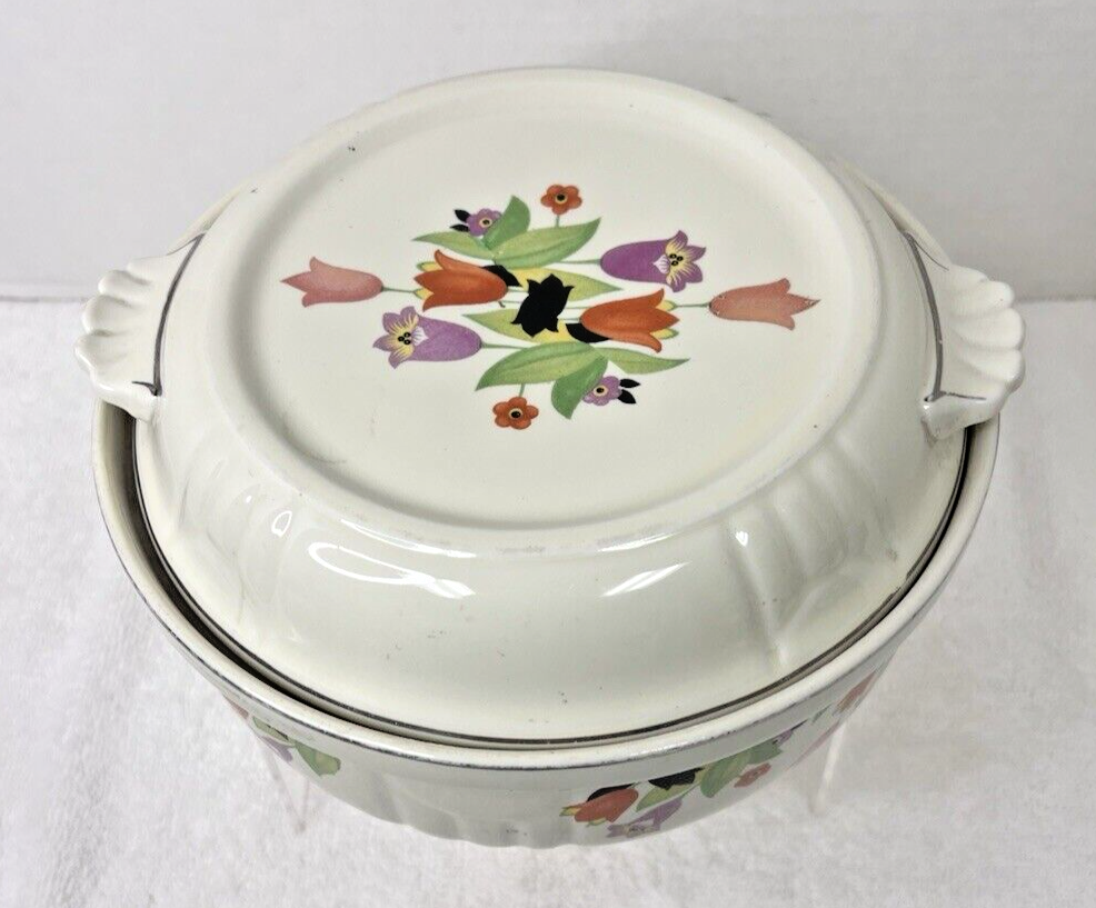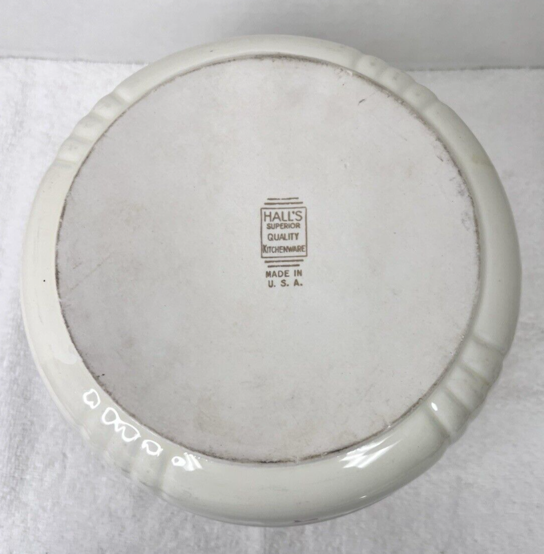 Crocus by HALL 1.5 Quart Radiance Casserole with Lid In Good Shape Gold Wear IN good shape however the gold trim is worn. The base measures 8 1/4 wide x 3 inch tall is about 8 5/8 across tab handles ok it has 2 tiny dark spots also it has a transparent spot that you can see when the lid is tipped in the light right, we do have a picture of both of these