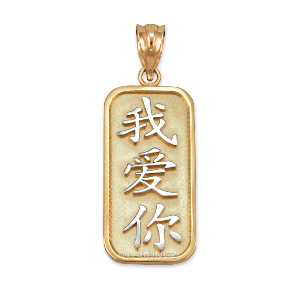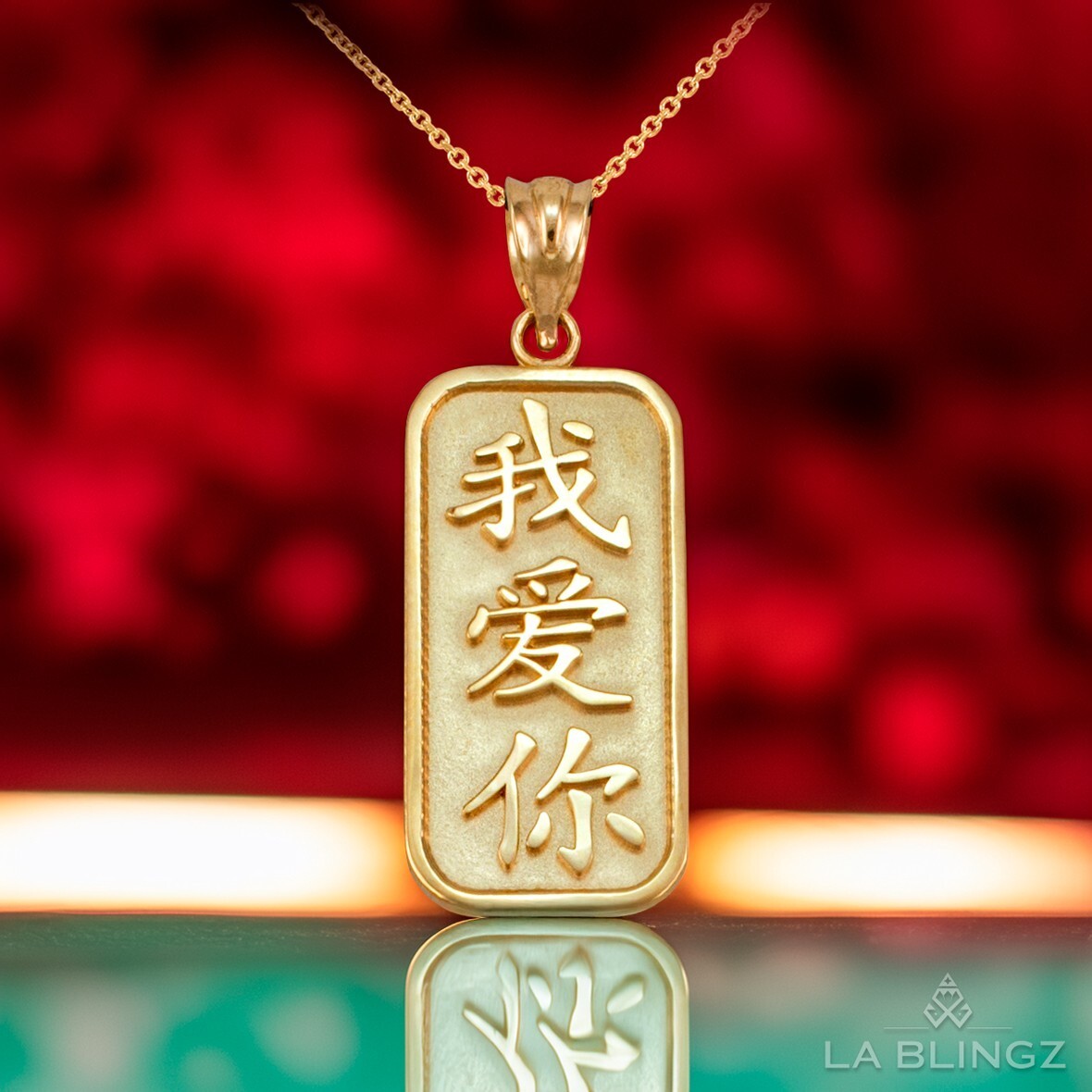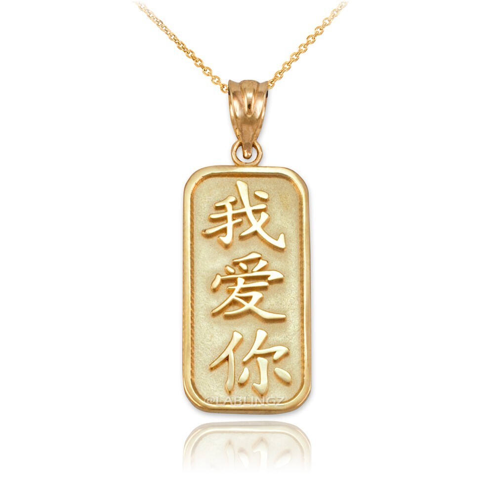 Gold Chinese I Love You Pendant Necklace Rectangle 10K 14K Satin Cartouche Charm