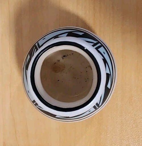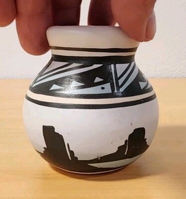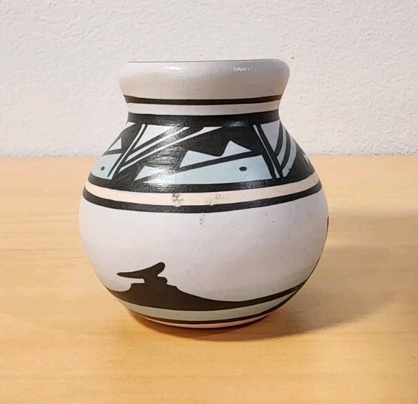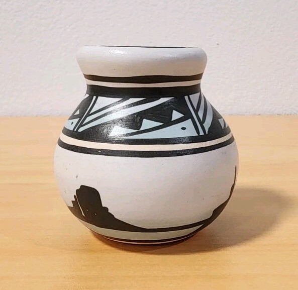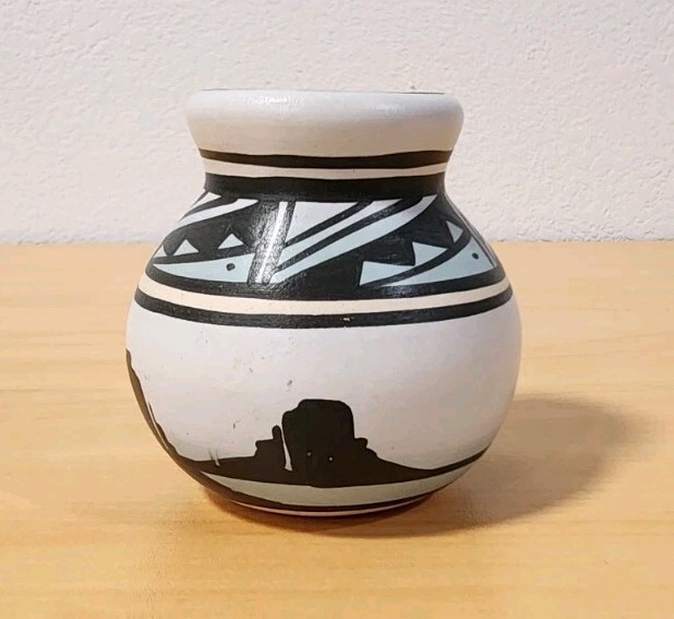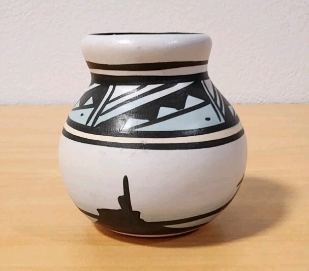 Features classic black-on-white geometric banding around the neck and shoulder, with a silhouette landscape scene around the base. The light blue color visible in the image is characteristic of the "rainbow" style. In excellent vintage condition with no chips or cracksMade in the USA, originating from the Navajo Nation.