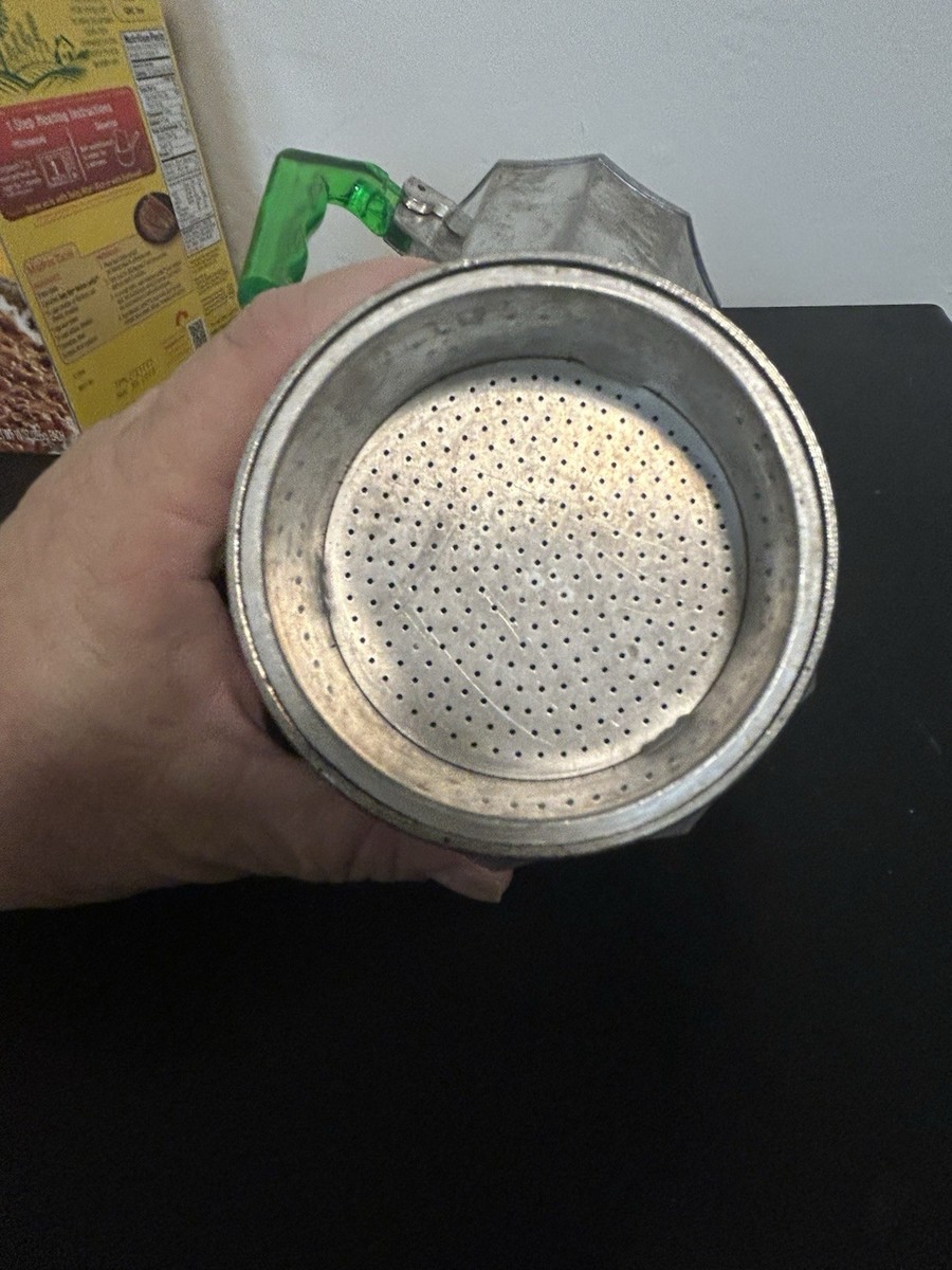 The Vintage Pezzetti Moka Express Stovetop Espresso Maker with a green handle is a classic Italian-made stovetop espresso maker crafted from aluminum. This manual espresso maker features a metallic finish and is designed for brewing rich and flavorful espresso. The Pezzetti brand is known for producing high-quality coffee equipment, making this vintage piece both a stylish addition to any kitchen and a reliable tool for enjoying a delicious cup of espresso.