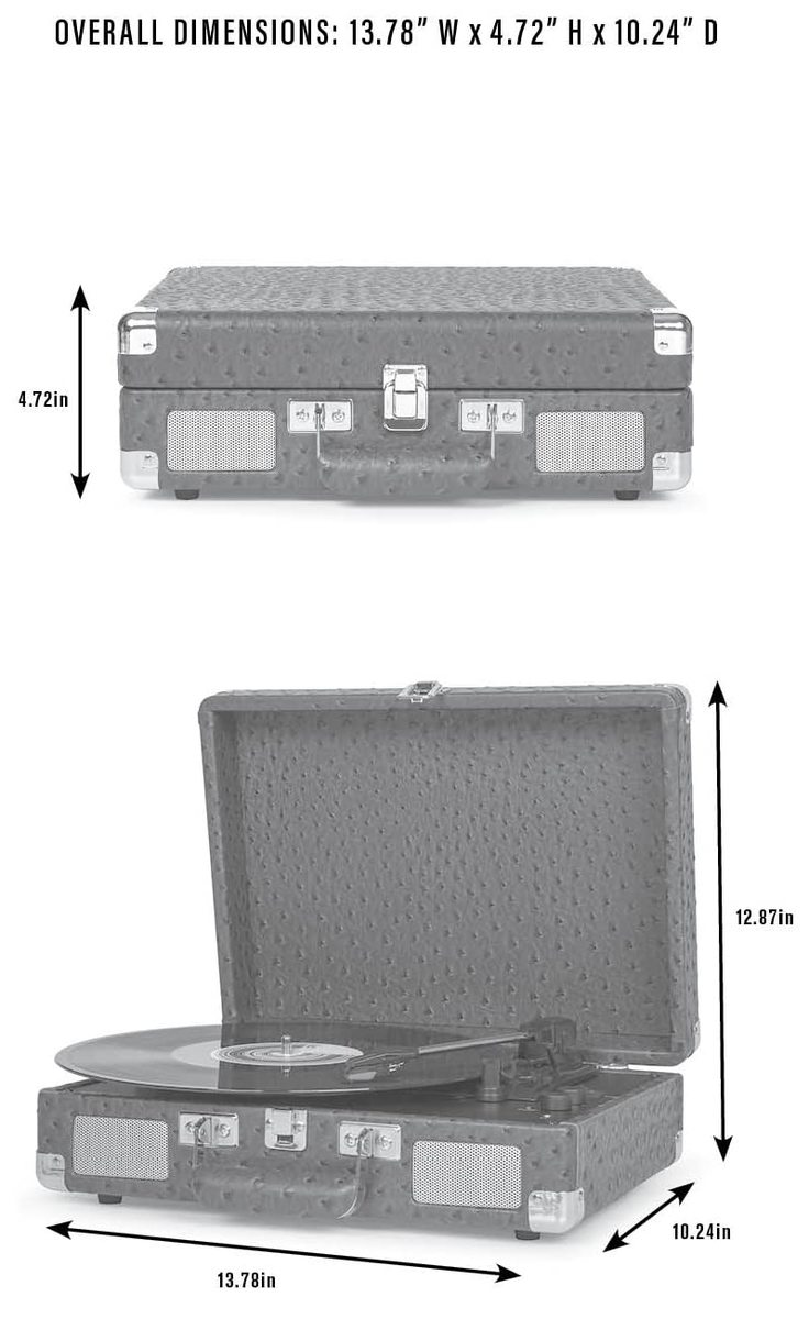 THREE-SPEED BELT-DRIVE TURNTABLE: Plays 33 1/3, 45, and 78 RPM records; Use the cueing lever to lower the needle and fine-tune playback with adjustable pitch control,QUALITY SOUND CONNECTION: Dynamic full-range stereo speakers with aux input; Use the RCA output to connect to your stereo system or the headphone jack for private listening,CONVENIENCE AND PORTABILITY: Setup is easy and will have you enjoying your vinyl in minutes; Take your tunes anywhere with the portable suitcase design and carry handle,DESIGN: Inspired by 100 years of Crosley innovations, our products blend vintage looks with modern technology; Crosley Radio products are proudly designed in the USA and come with USA-based customer support