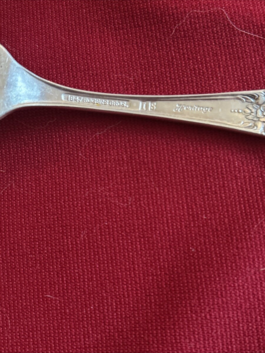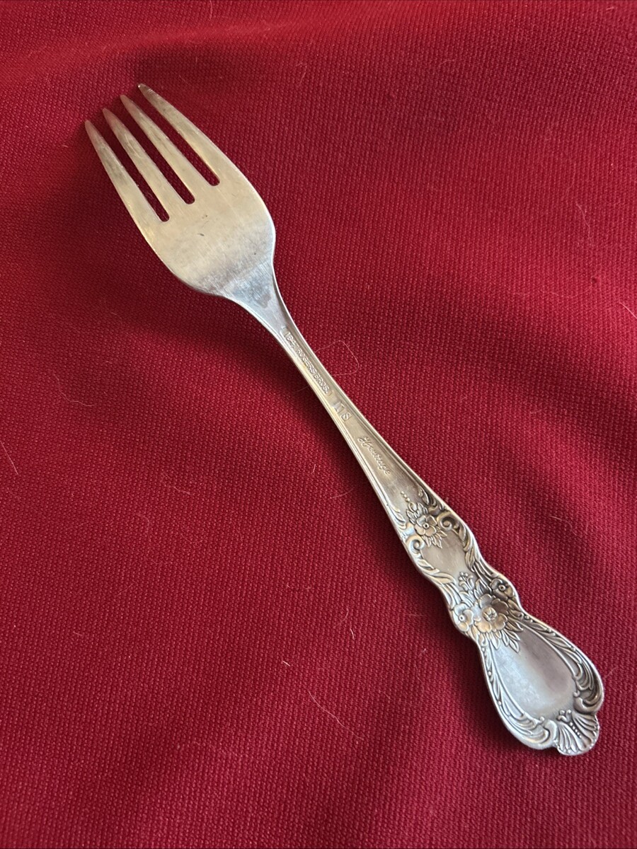 The product is a 7.5" heritage international silver dinner fork made by 1847 Rogers Bros. It is an original piece with a floral handle pattern, crafted from silver plated material. The fork is designed with a silver color and comes from South Korea (Republic of Korea). Perfect for collectors of fine flatware or those looking to add a touch of elegance to their dining set.
