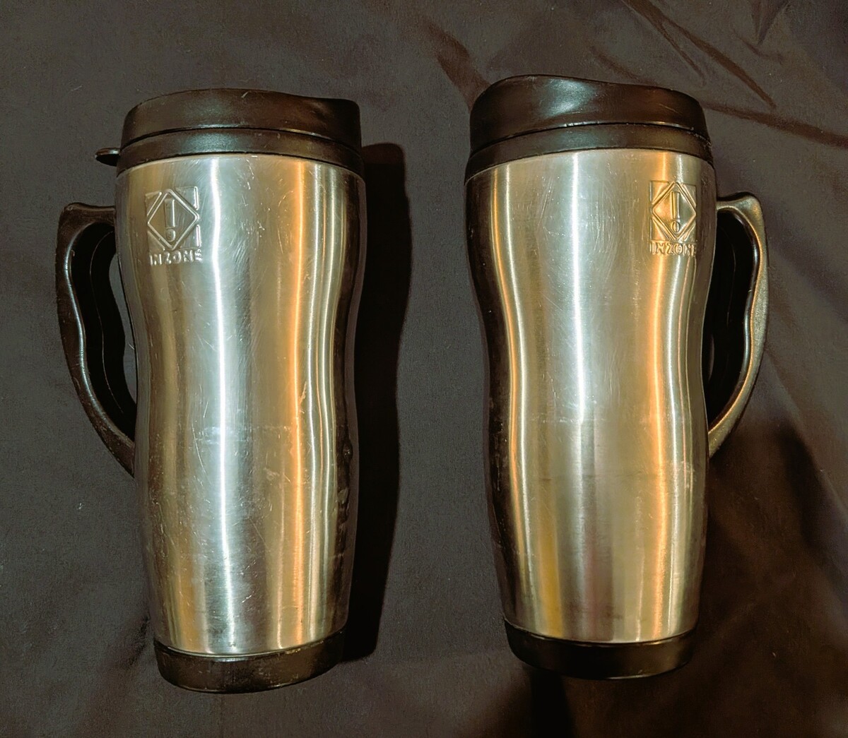 The mug in the image is a vintage Inzone branded stainless steel travel mug. These mugs were part of the "Inzone" line by the company Bubba, which is well-known for its large, insulated "keg" style travel mugs.