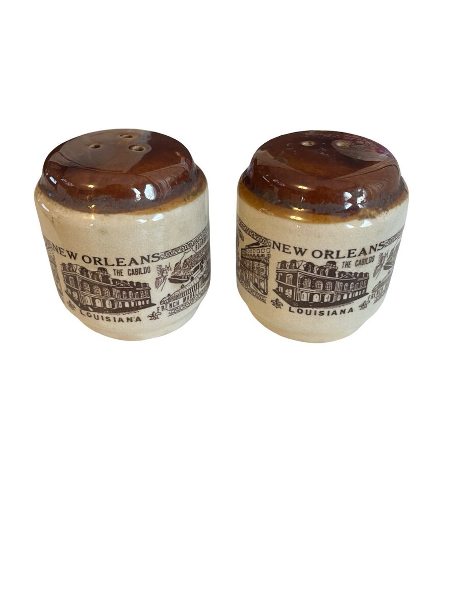 Vintage New Orleans souvenir salt and pepper shaker set featuring detailed brown transferware illustrations of iconic landmarks including The Cabildo, Bourbon Street, and the French Market.