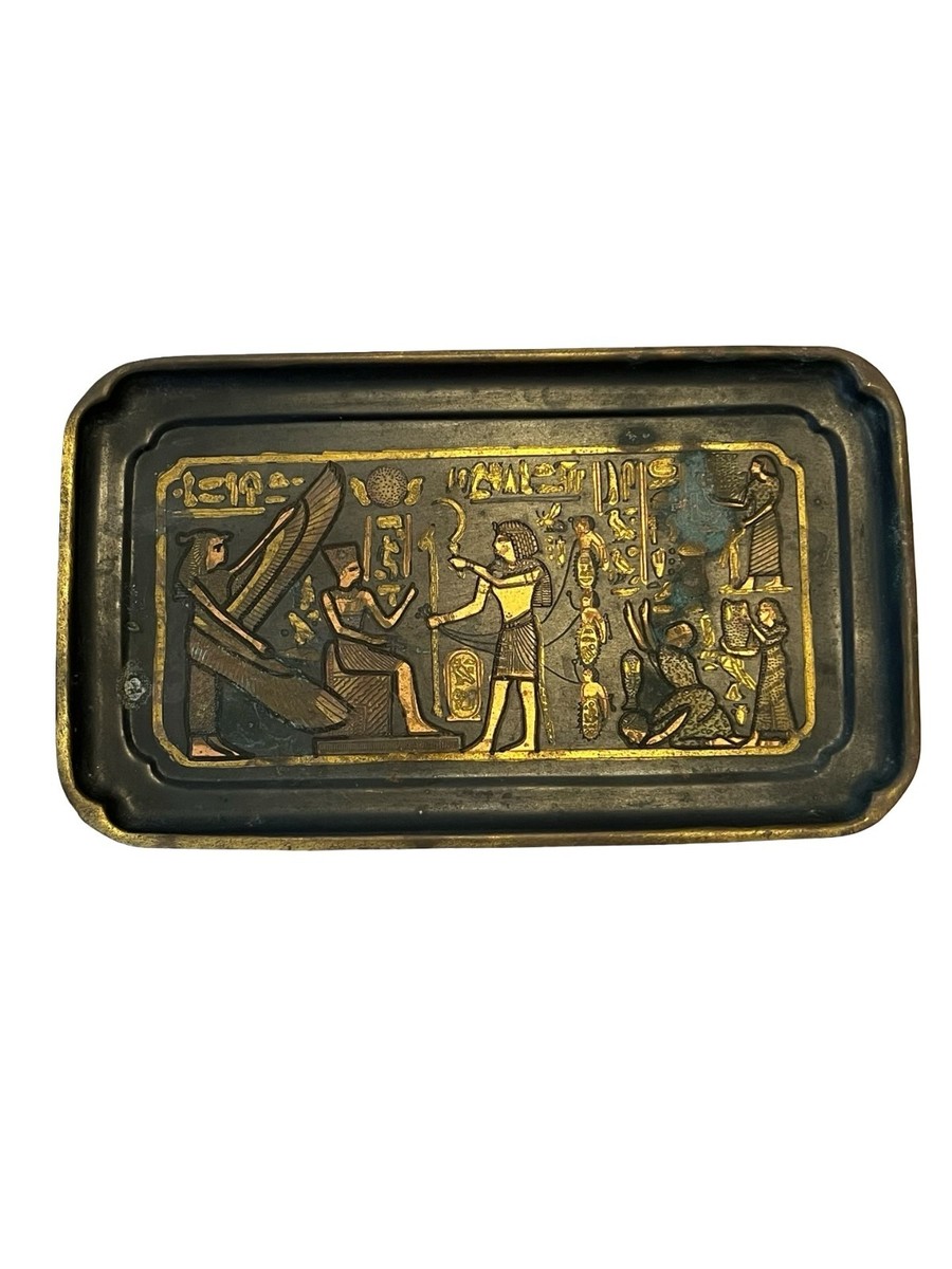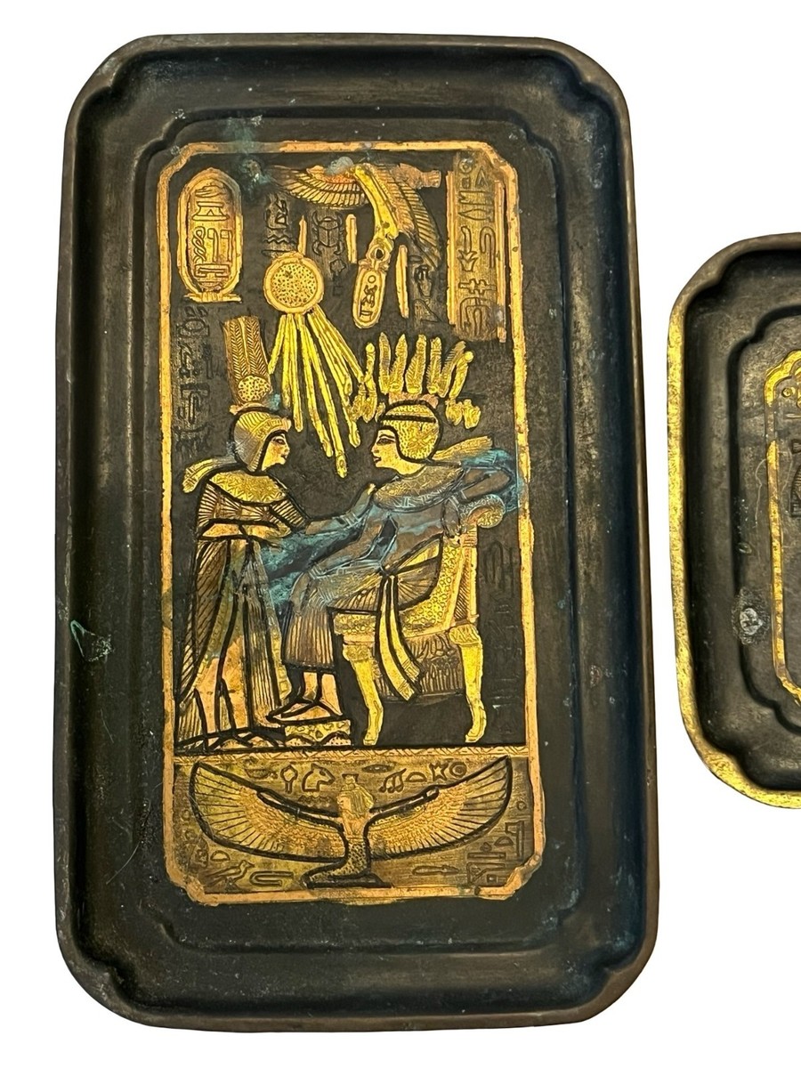 Vintage Egyptian Revival Wall Plaques Black Gold Hieroglyphics Metal Art Set 9.5x6 Mid Century