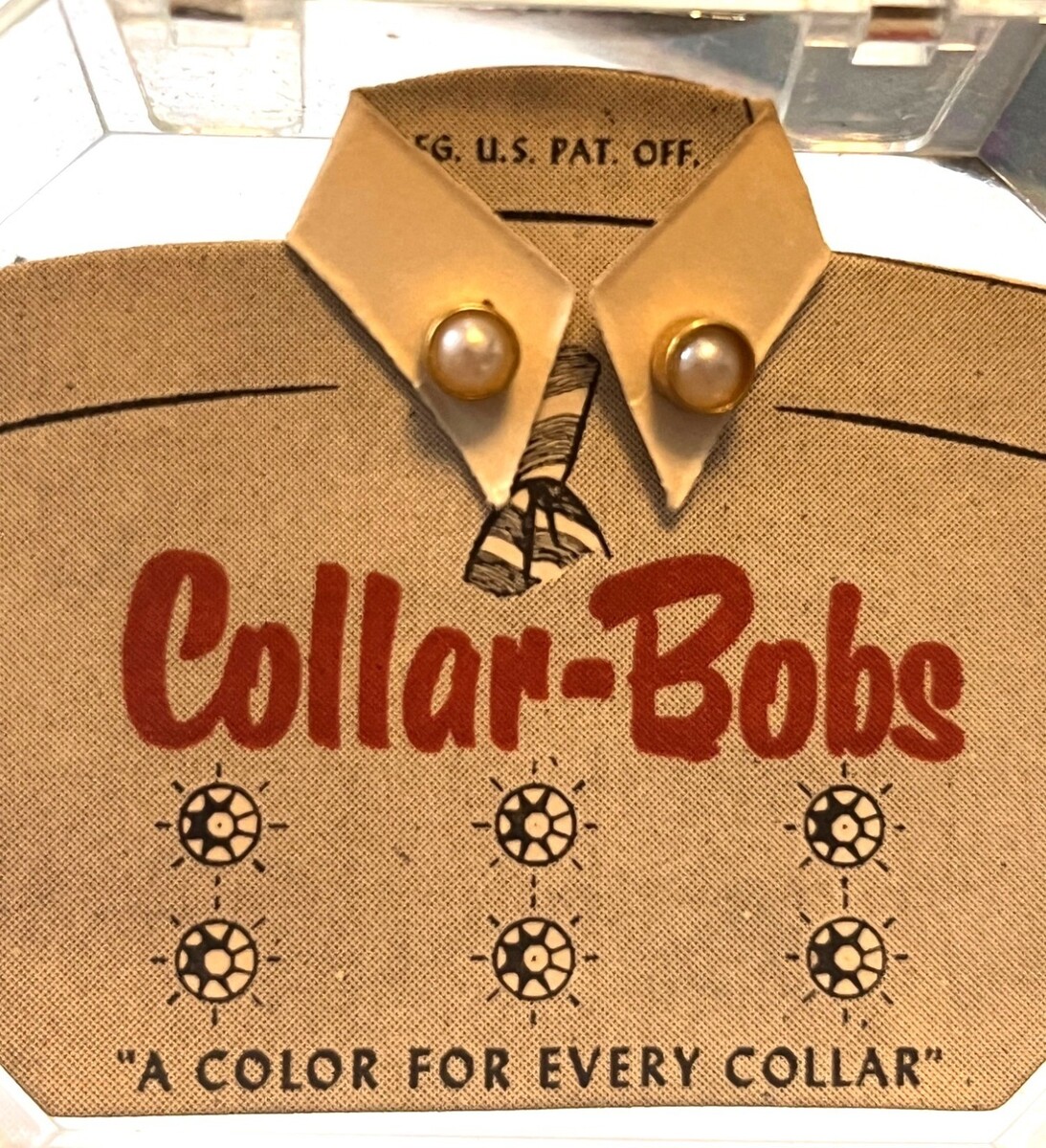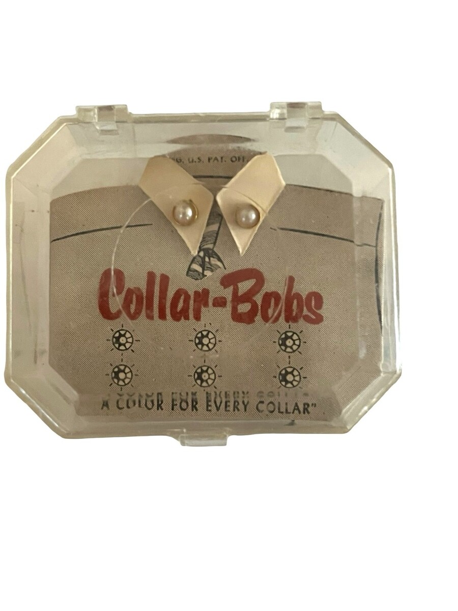 Vintage Collar Bobs set with faux pearl collar tips in original clear plastic case. Made by Collar Bobs Co. of San Antonio Texas.