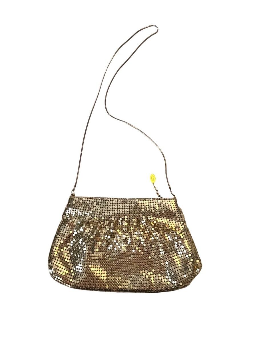 Vintage gold tone mesh shoulder bag featuring a shimmering metal mesh body with a sleek snake chain strap and pleated front design. Interior tag reads metal mesh made in China.