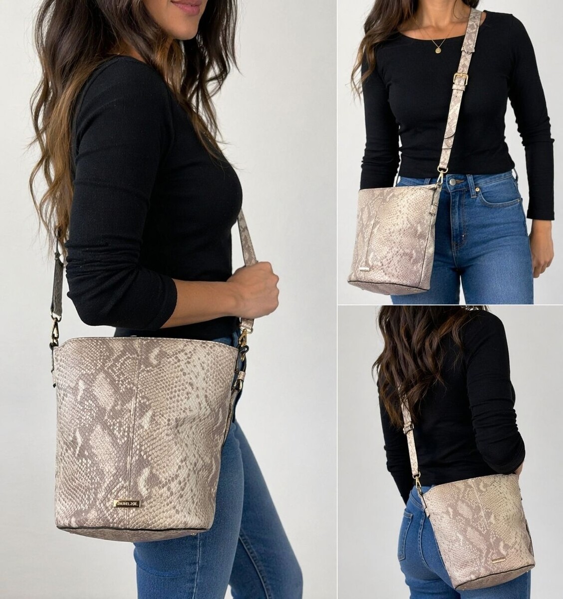 Chic Rachel Zoe crossbody bag featuring a neutral beige snakeskin embossed finish with gold tone hardware. Structured silhouette with zip top closure and adjustable strap makes it perfect for everyday wear or travel. Versatile color pairs easily with a wide range of outfits.